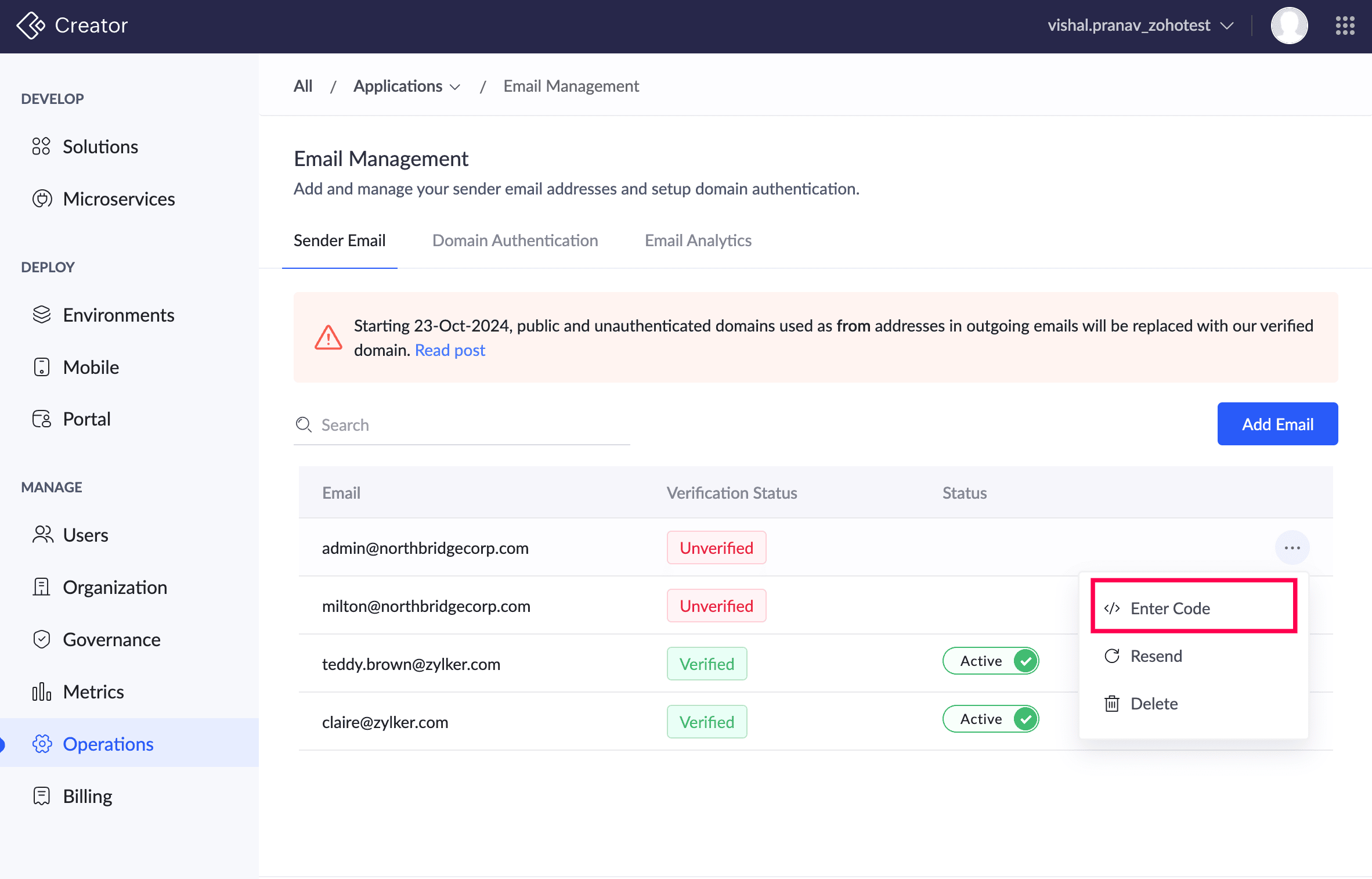 - Adding new email addresses, post integration with ZeptoMail, can be done only once the domain is verified in the ZeptoMail.