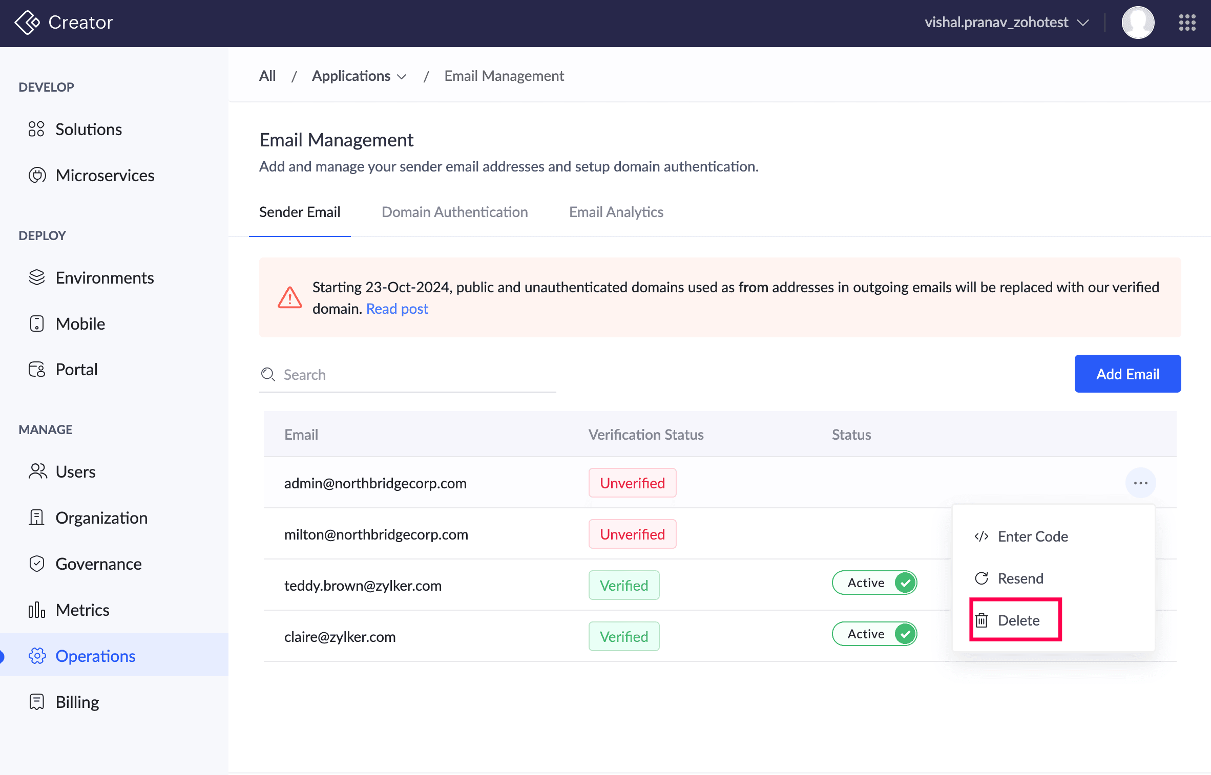- Navigate to Operations on the left pane and select Email Management under Applications .