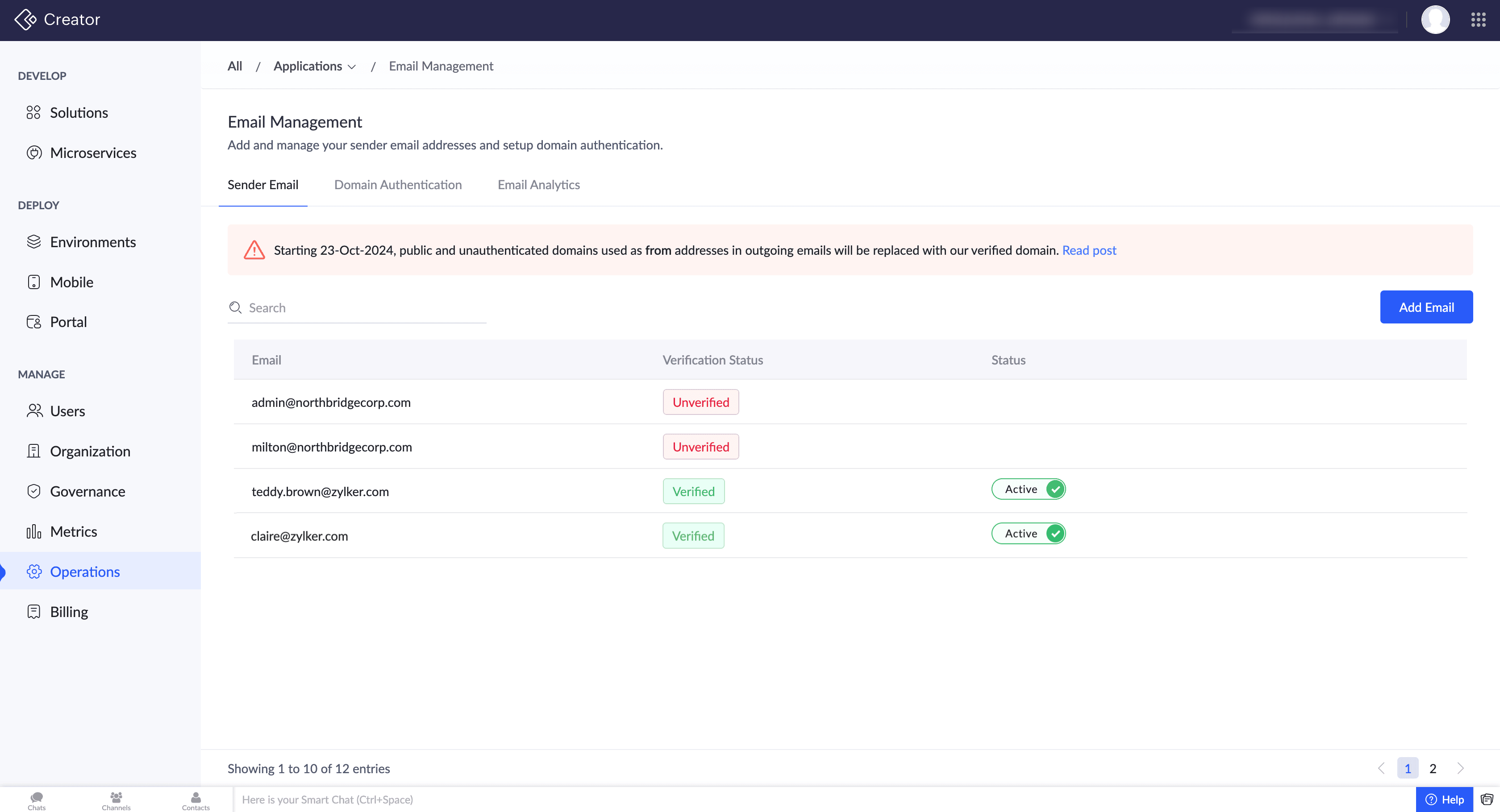- Click the Sender Email tab. This allows you to add From addresses for emails sent from your Creator app.