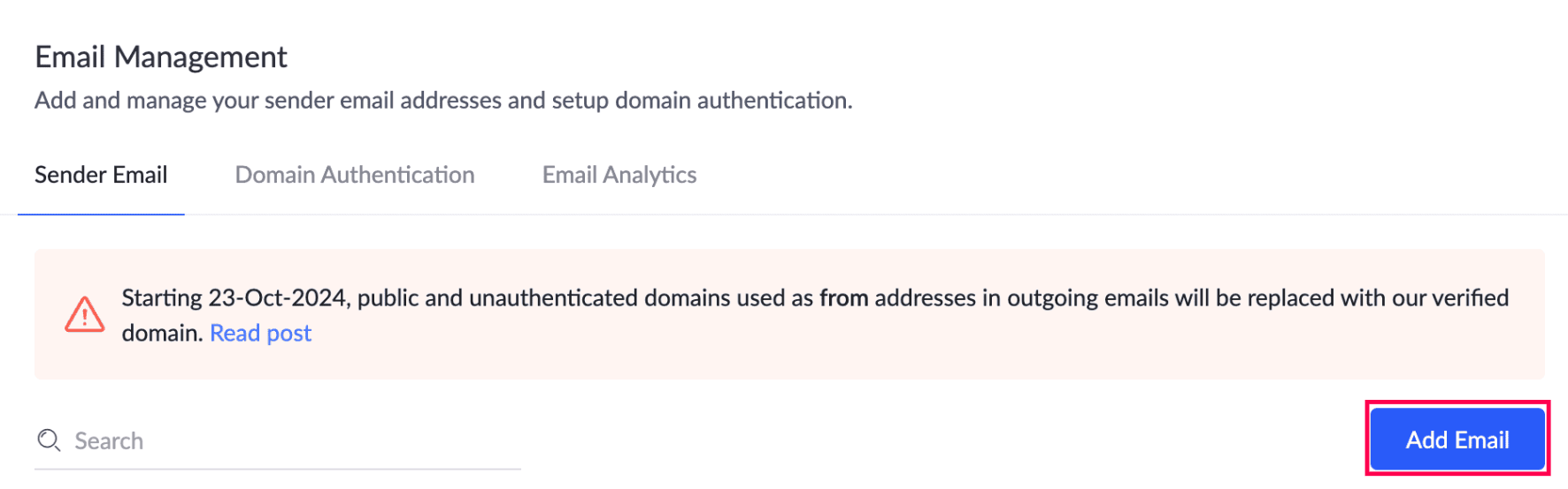 Note: Email addresses with public domain (Eg. abc@google.com, xyz@outlook.com) cannot be added here as sender email. Only email addresses with a custom domain (eg. xyz@yourcompany.com) can be added.