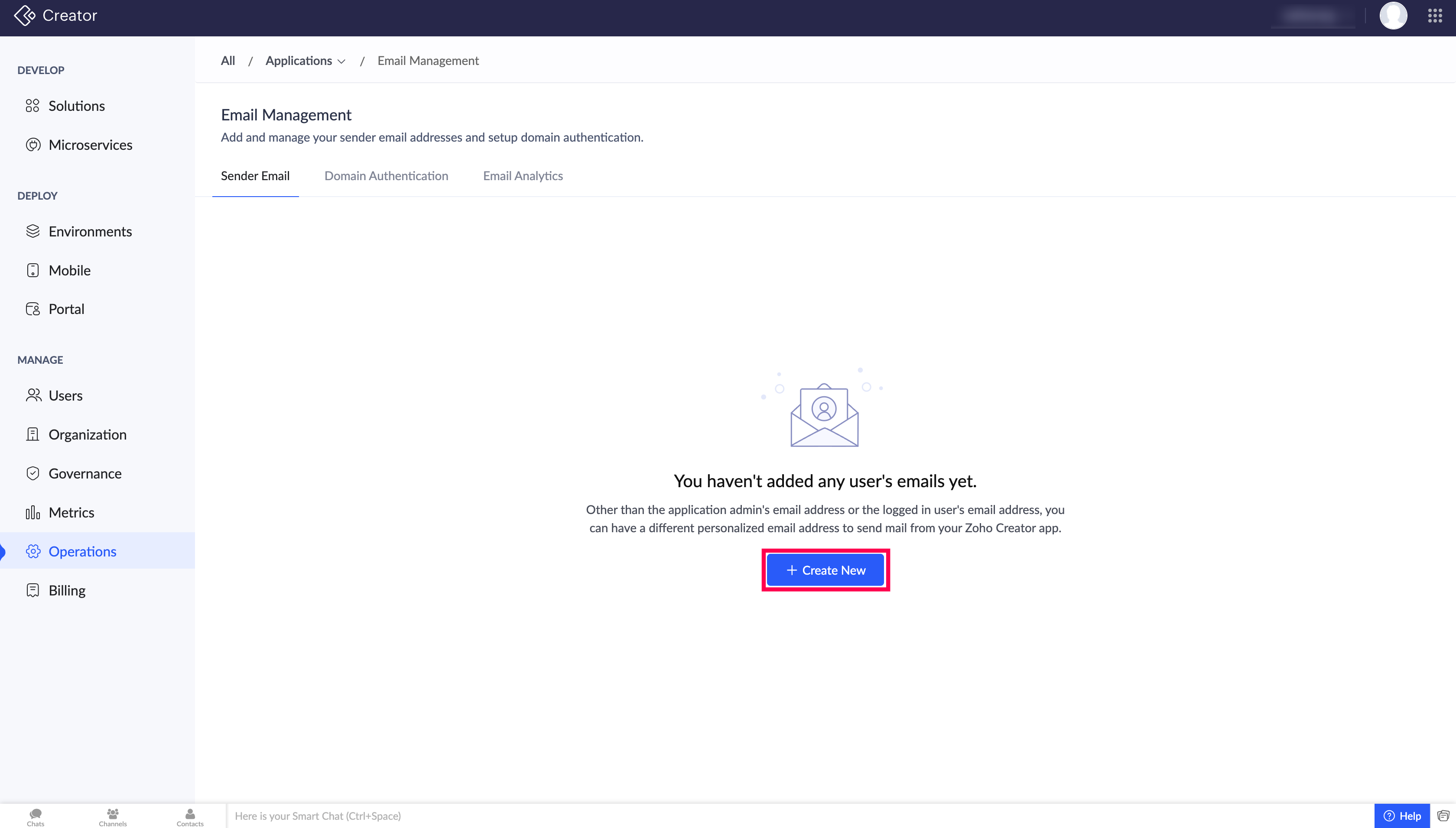 - If you’re adding a sender email for the first time, click Create New. A pop-up window will appear.