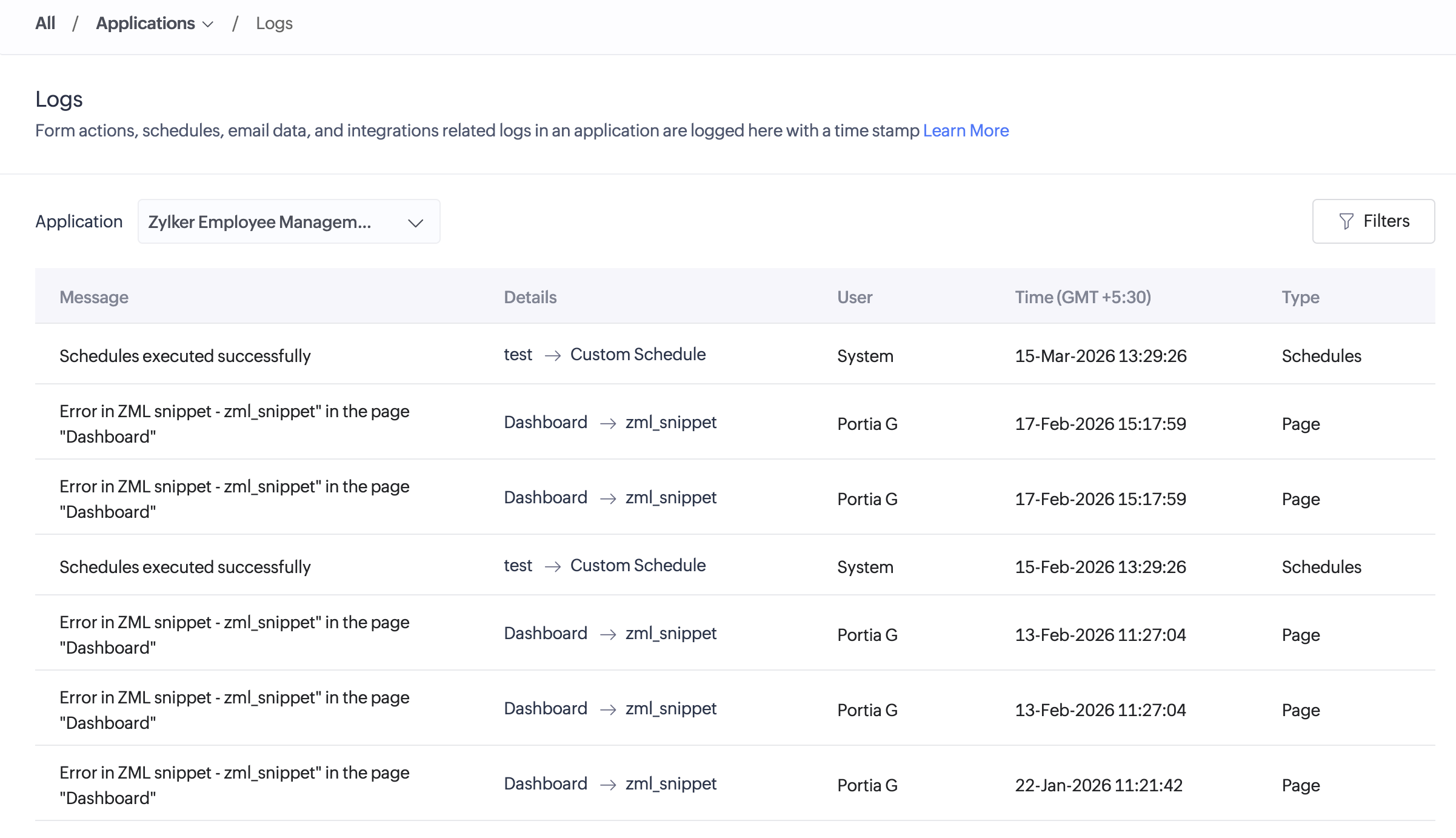 This help page is for users in Creator 6. If you are in the older version (Creator 5), click here. Know your Creator version. Logs are automatically produced, time-stamped documentation of the history of actions, such as Form Actions, Schedules, ...