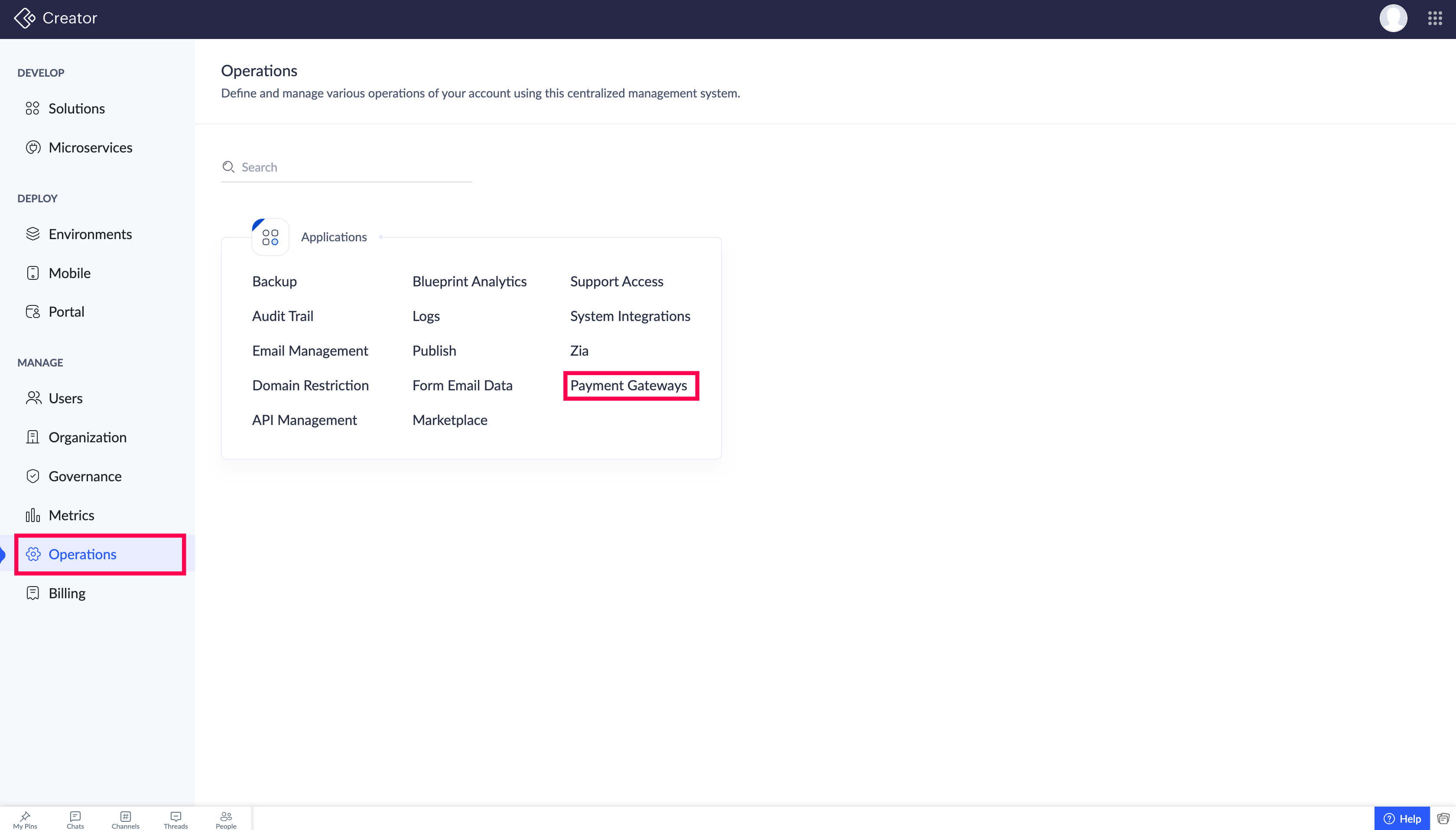 Navigate to Operations under MANAGE in the left pane of your Zoho Creator account. Click Payment Gateways under Applications to configure payment gateways for your account. Learn how to configure a payment gateway