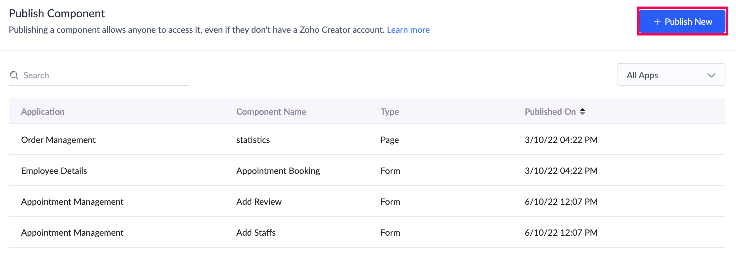 3. The Publish Component page will appear and list all the components that have been published. Click + Publish New.
