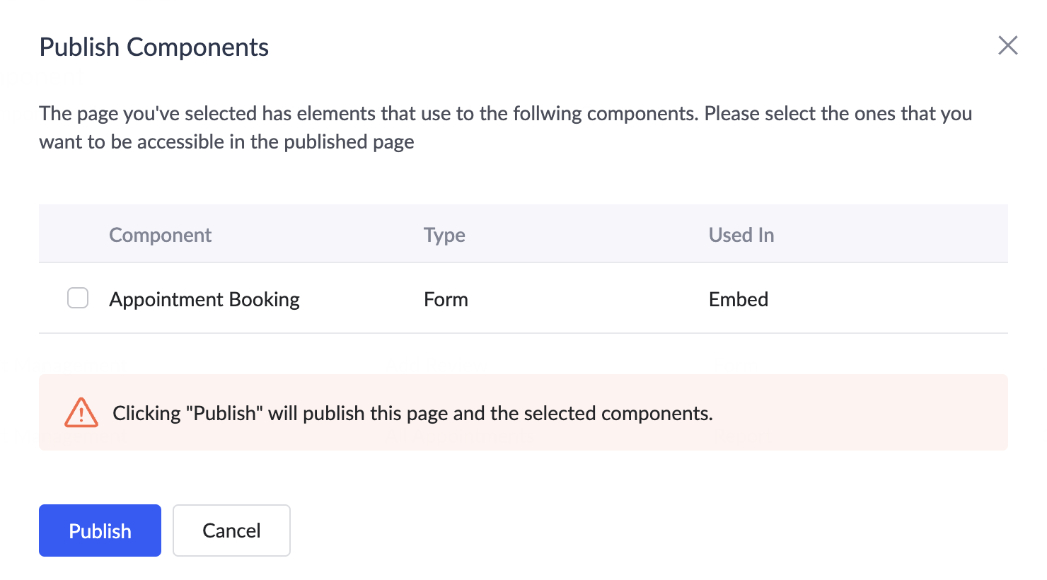 5. If the selected page is not configured to display application components (forms, reports, search, and other pages) inside it, you'll be taken to step six. If not, in the Publish Component pop-up, you'll have to select the components that you want to be accessible in the page's published version, and then click Publish.