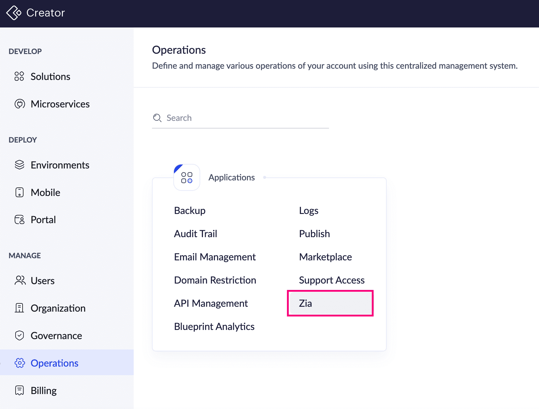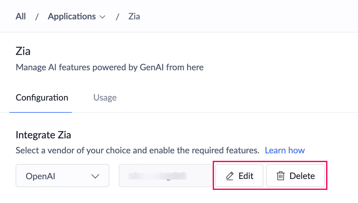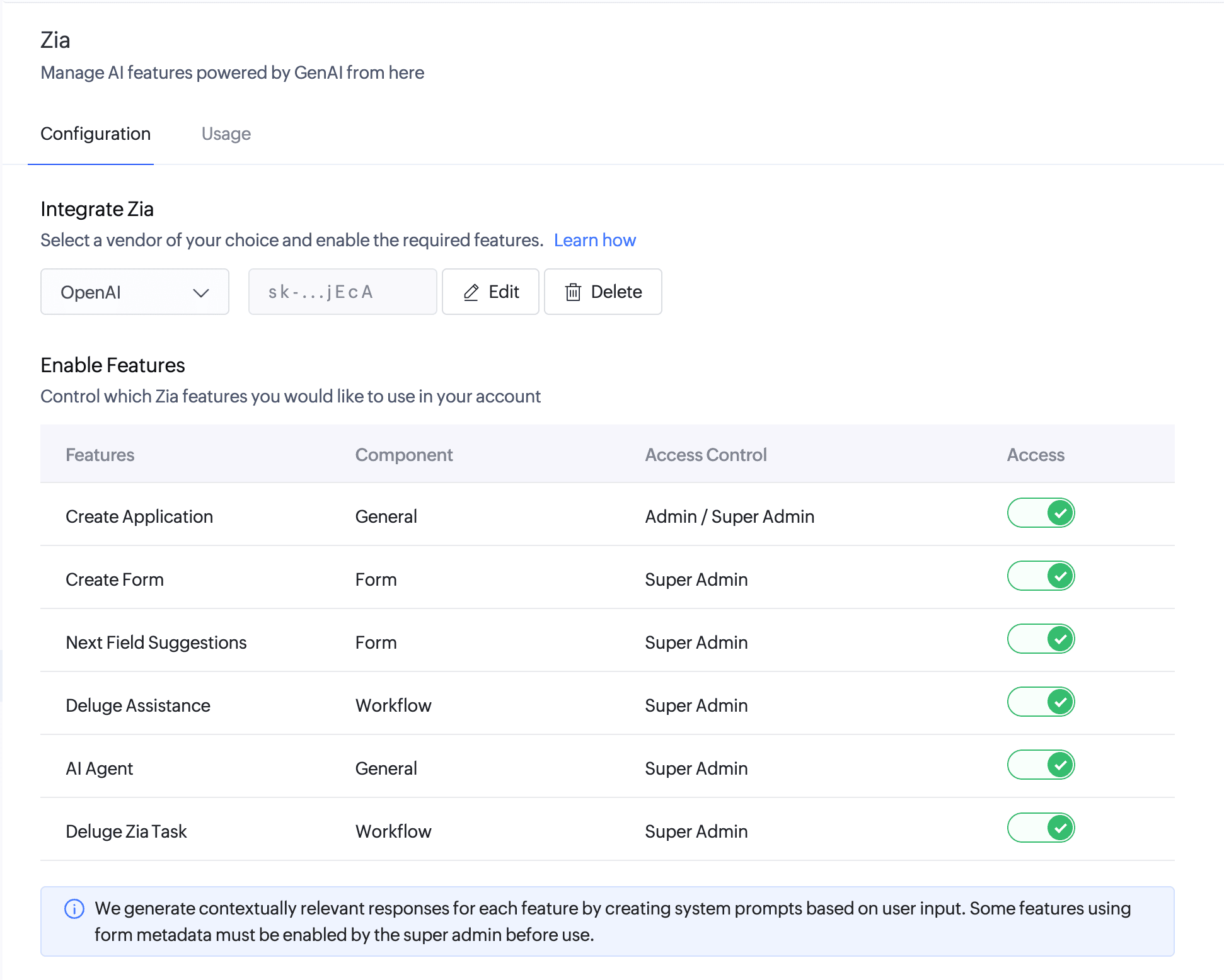 Note: After configuring Zia, all supported AI features are enabled by default. These features can be disabled if required. This enables you to leverage the combined capabilities of Zia and GenAI to access the AI features in Creator.