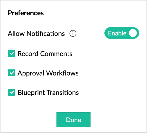 You can choose what kind of system notifications you'd like to receive by selecting the checkboxes such as Record Comments, Approval Workflows, and Blueprint Transitions. Click Done to save your notification preferences.