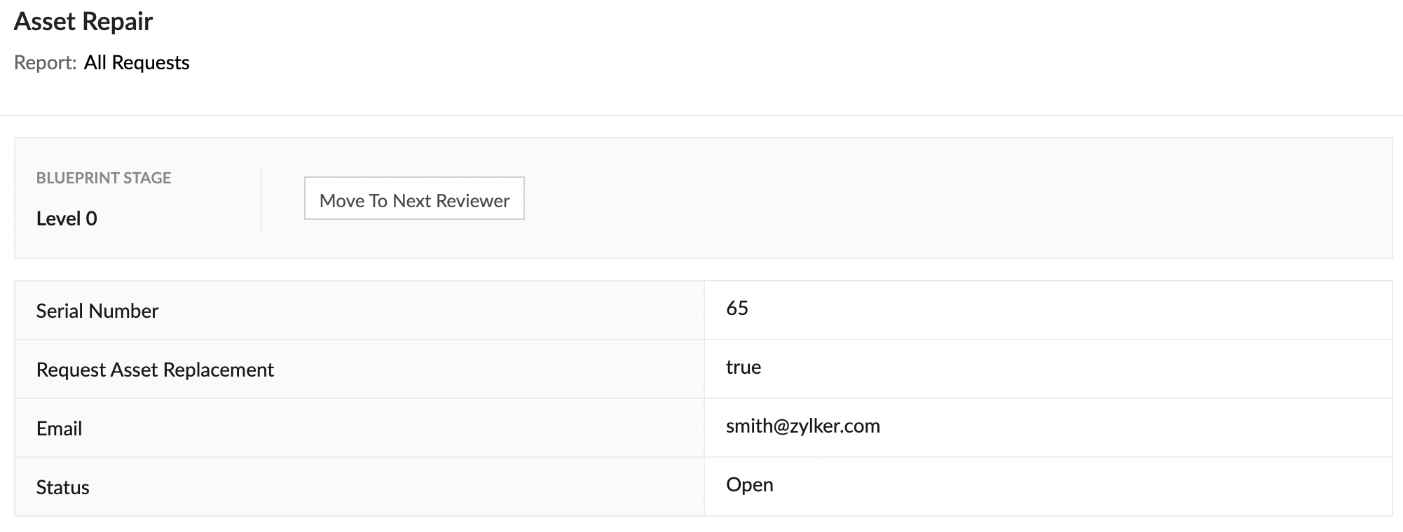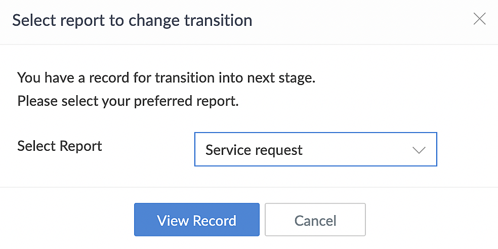 If your permission to the particular report where the comment has been made gets revoked, a popup will be displayed to switch to another type of report for which you have permission. - Upon clicking the Blueprint card, a new tab will open with the record summary view for record in which the transition has to be performed.