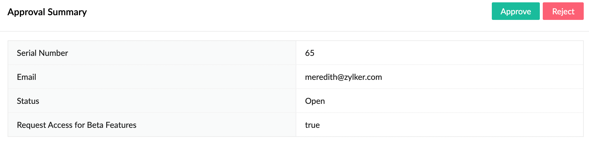 - Upon clicking the Approval card, a new tab will open with the Approval Summary view, in which the record can be approved or rejected.
