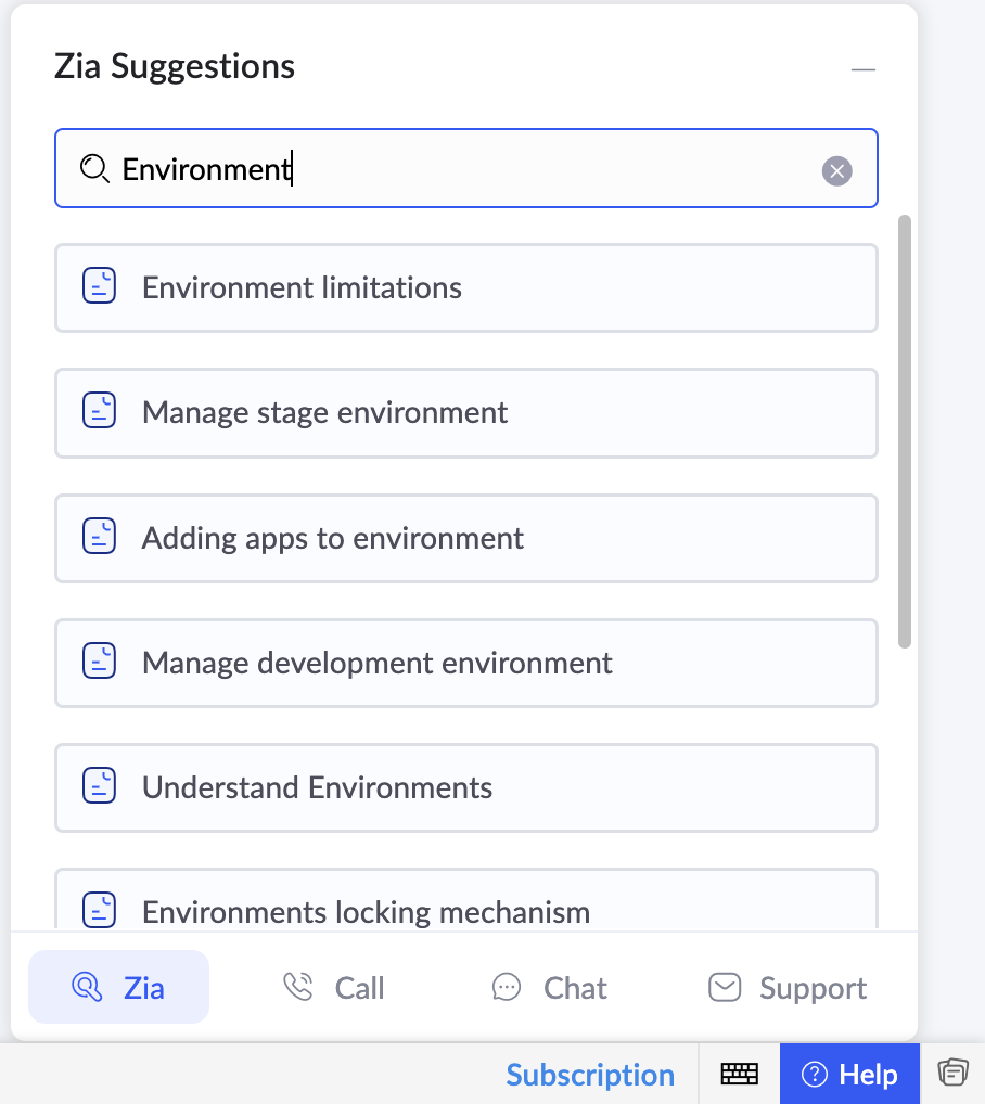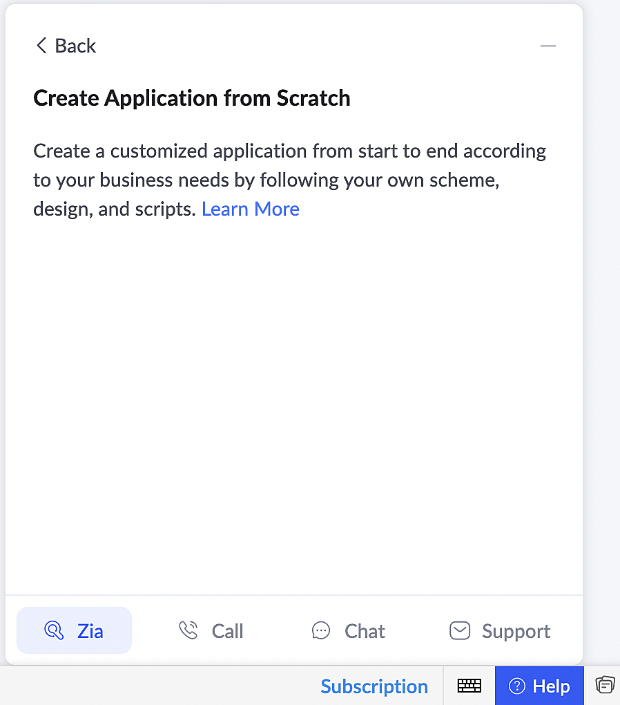 Zia (Zoho Intelligent Assistant) has an advanced NLP engine and is integrated with our vast Knowledge base. It instantaneously skims the knowledge base to provide you with suggestions based on the scenario you are in. For example, if you want to know how to create an application from scratch, Zia will provide you with the necessary information and also the link to the help document for the same.
