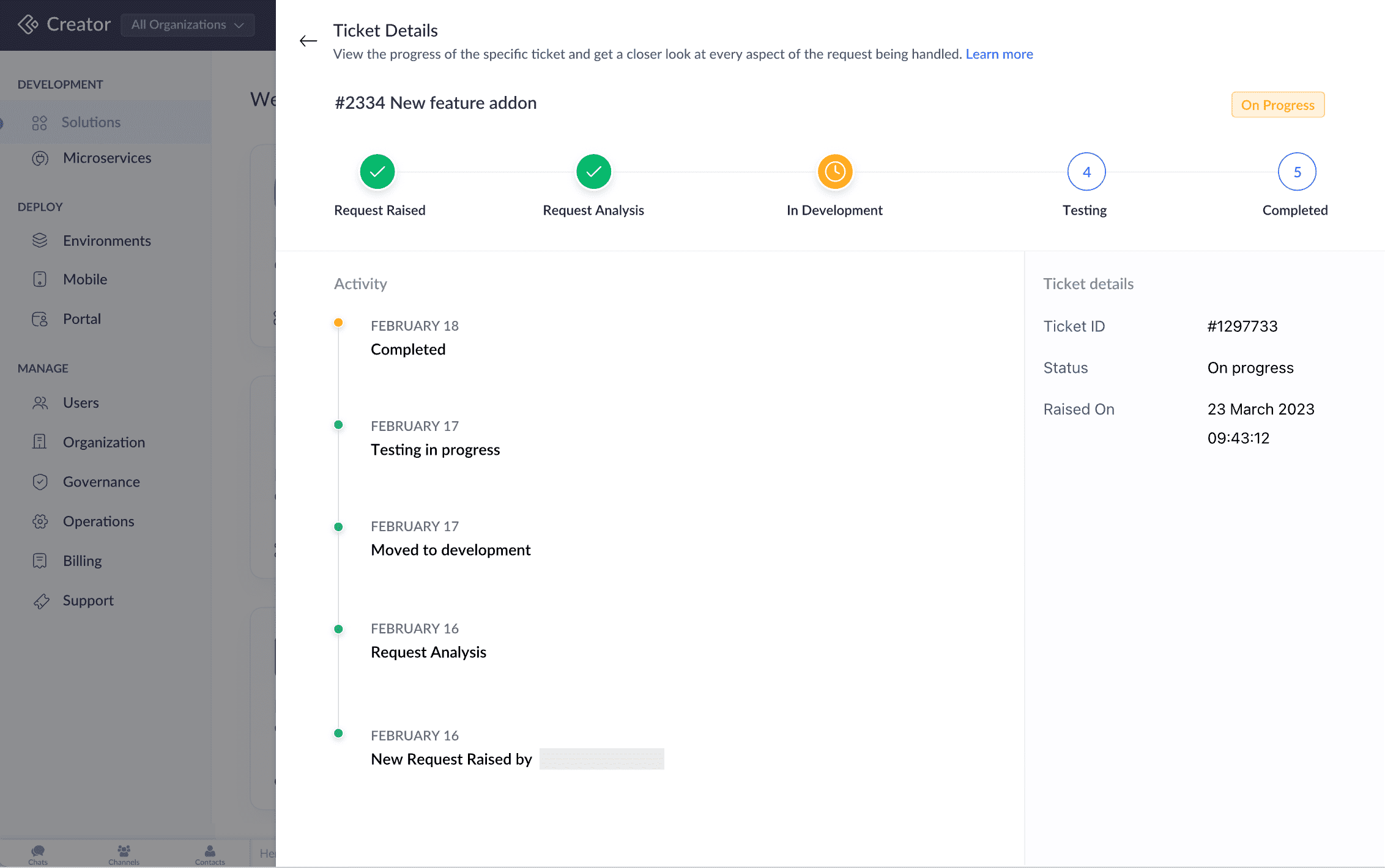 Click any one of the tickets to get a detailed view of the status and progress specific to that ticket.