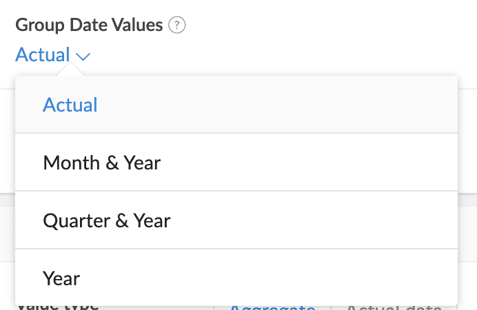 - Aggregate: Display the aggregate values such as Sum, the sum of the chosen field's values, or Count, the number of records that have a value for the chosen field.