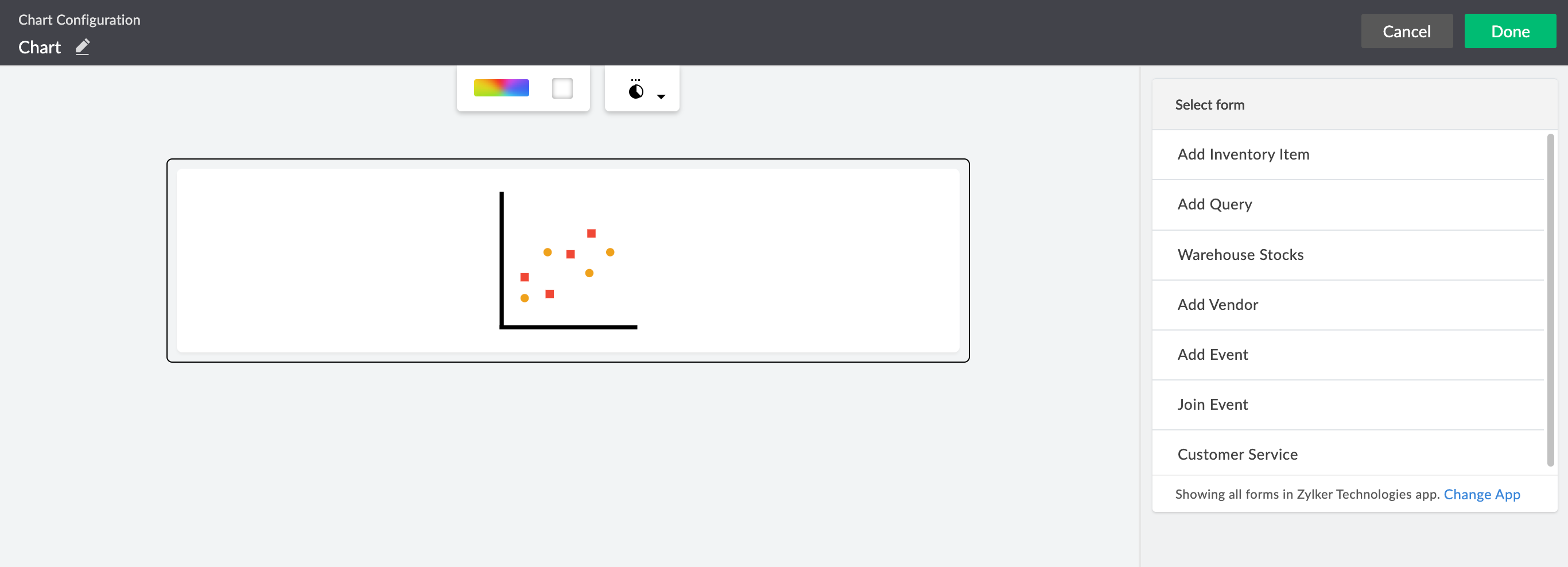 Note: The Select Form dropdown lists all the forms in the application you are currently working on. To select a form from another application, click Change App in the footer of the form dropdown. Select another application and click Done to view all of its forms.
