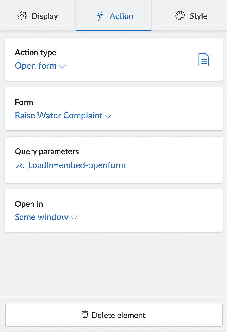 3. Specify the query parameter as zc_LoadIn=embed-openform, where openform is the name of the <div> container you'd mentioned above.