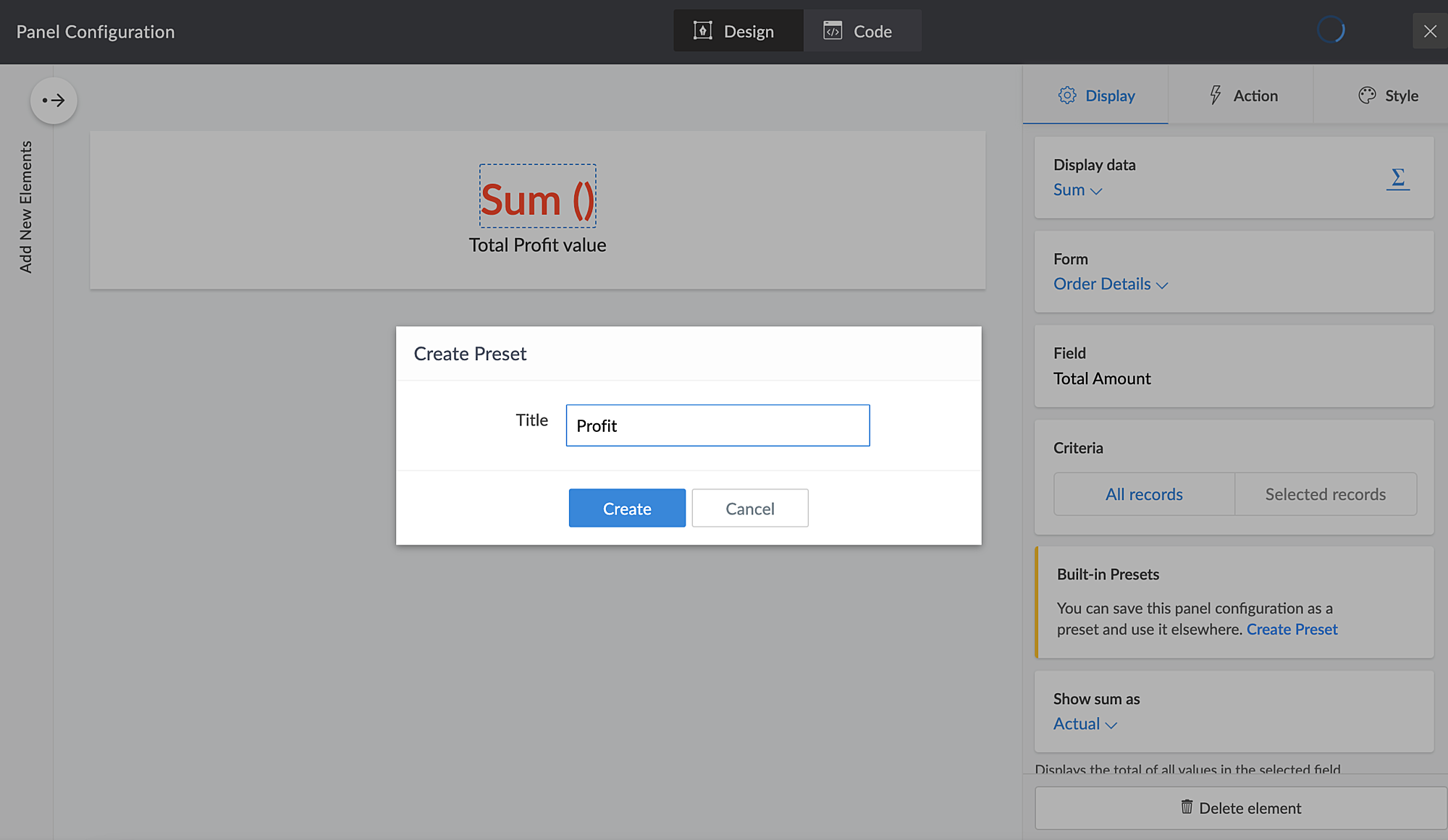 This page has a panel that displays the total amount for a day and you have configured it to calculate the "sum" of all the total amount fields present in your Order Details form. You can now save and reuse this panel configuration as a preset. Refer here to learn how to create a preset.