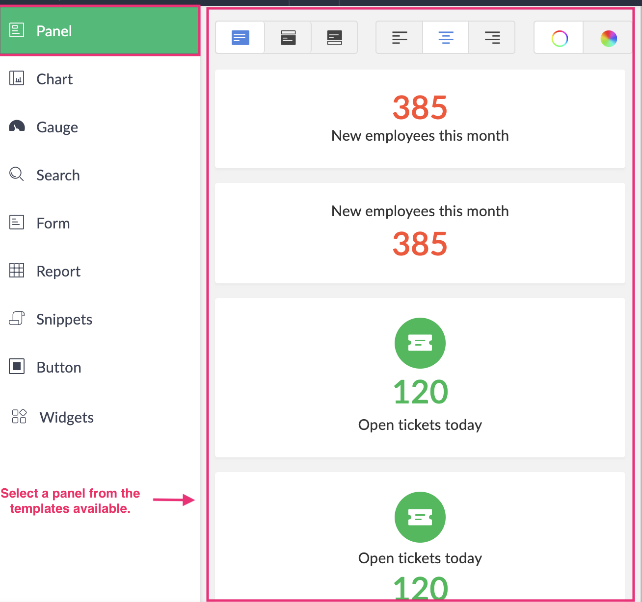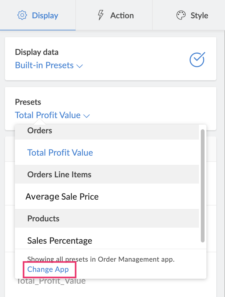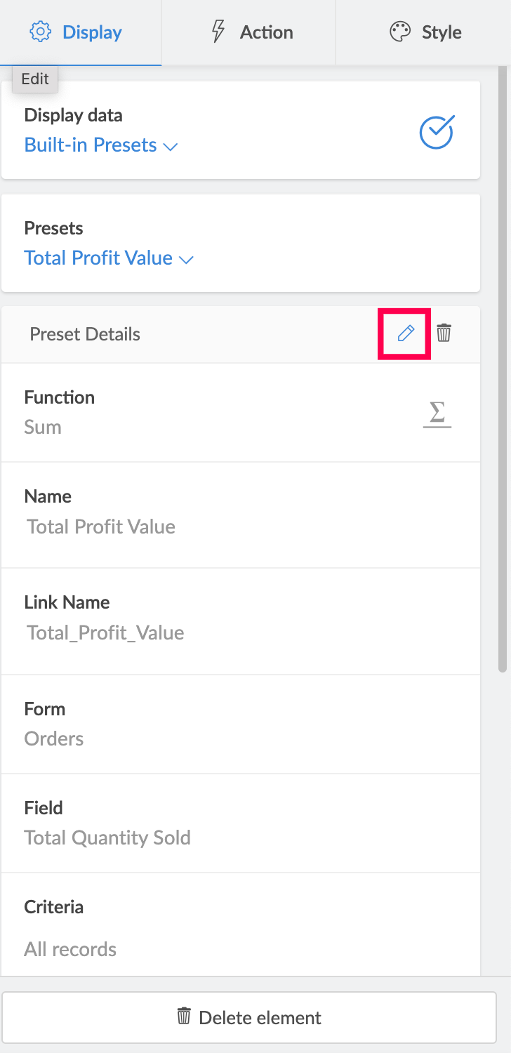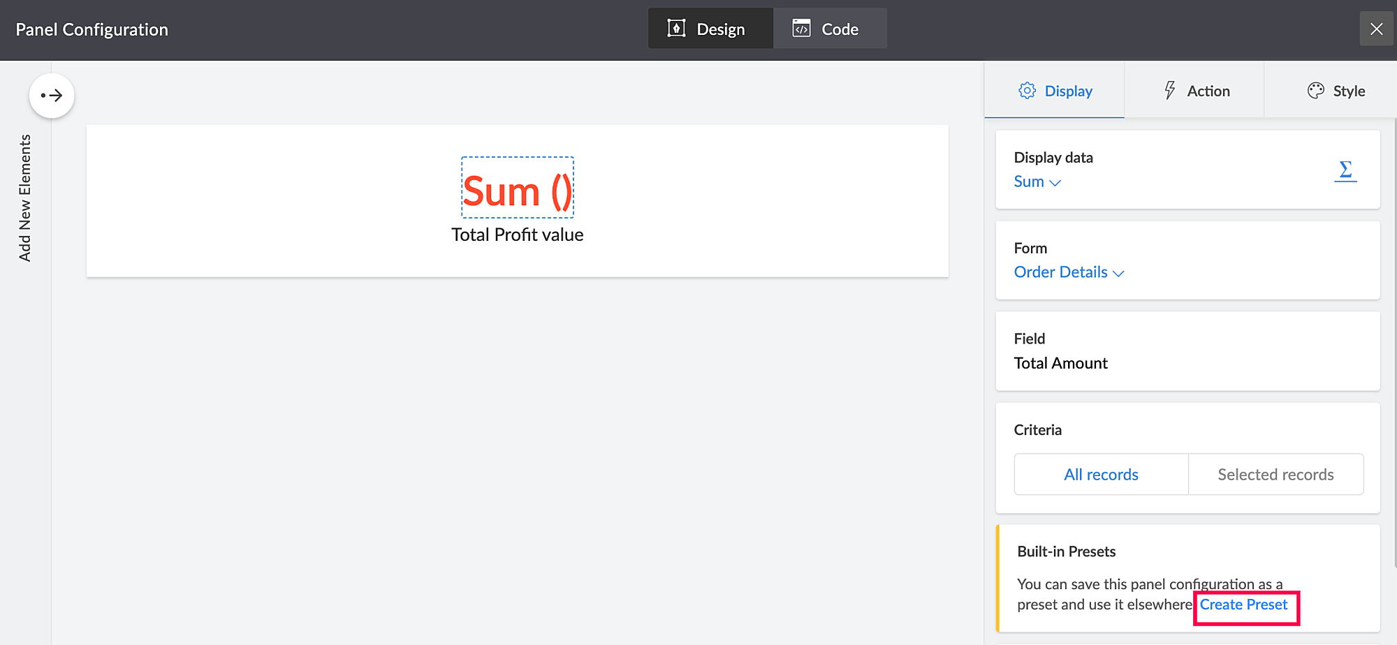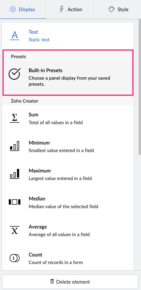 Creator enables you to save these panel configurations using built-in presets. Presets are saved configurations of your panel's display value (aggregates), that can be reused across forms and all other apps in your Creator account.