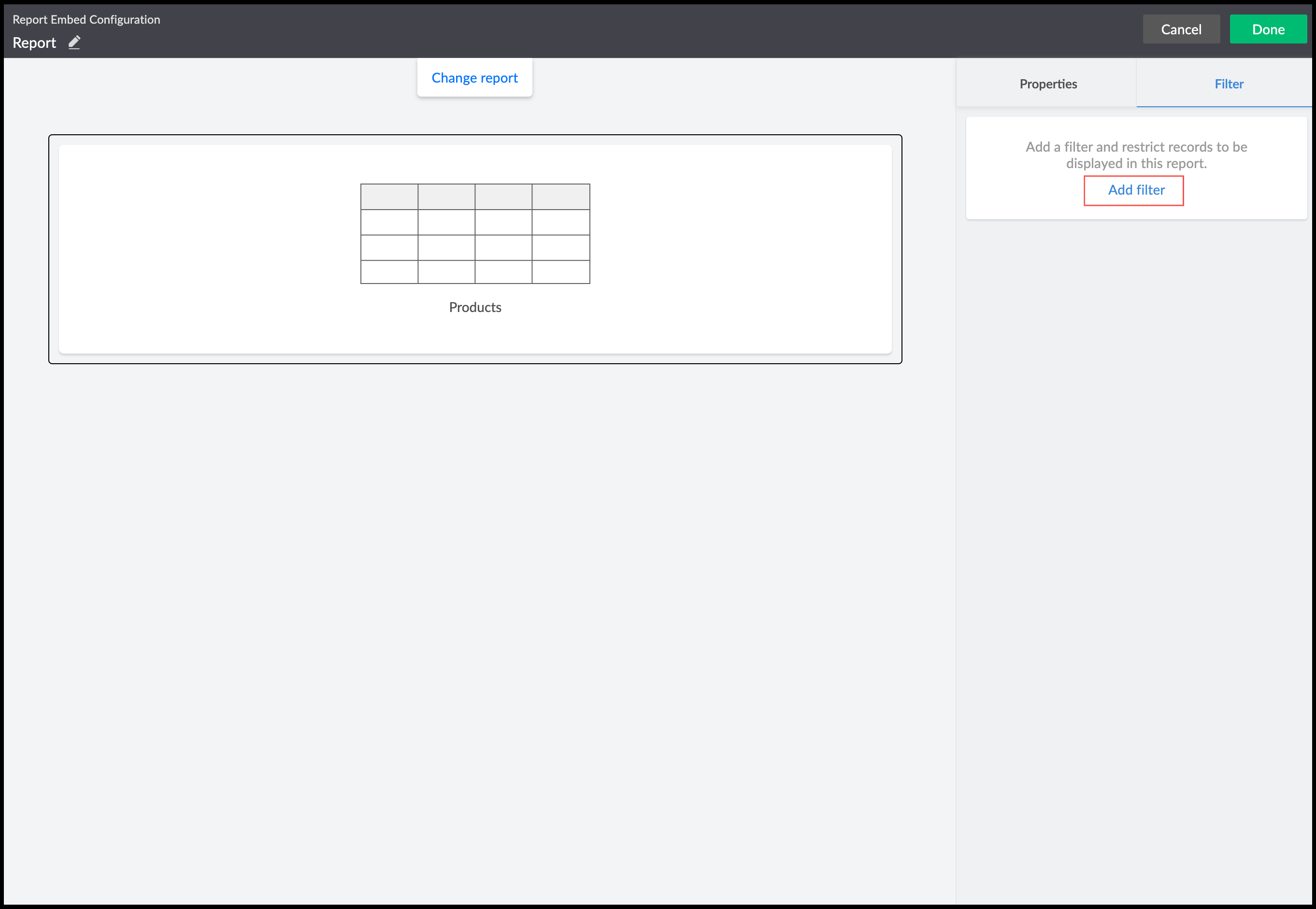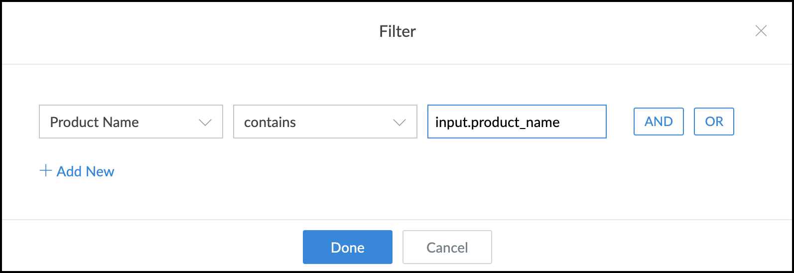 Set the required criteria to filter the report, then click Done . Fields displayed by the report can only be filtered using the search input, which is denoted by input.searchString :