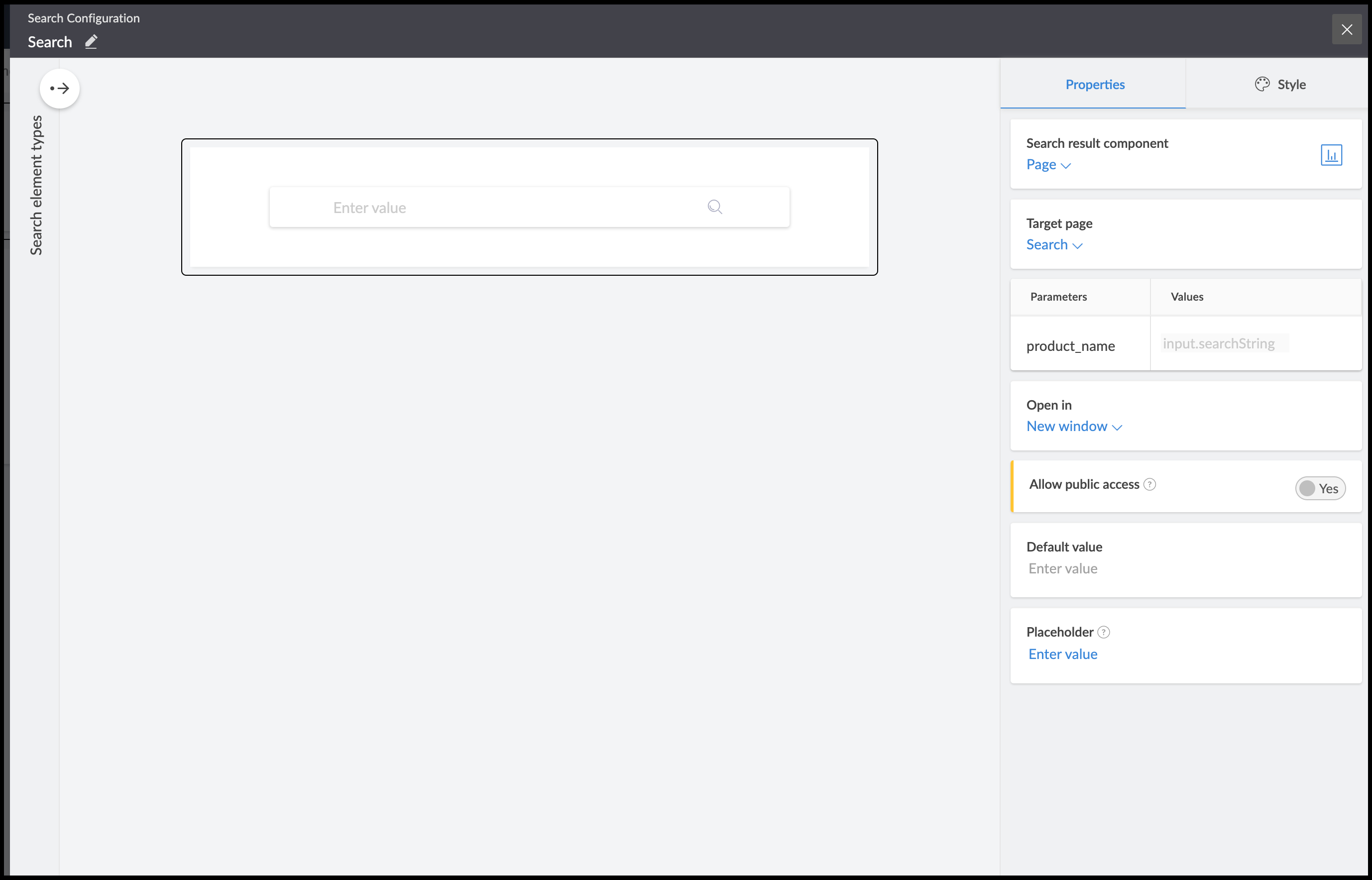 Set the Placeholder text. It's "Enter value" by default. This is the value that will appear in the search bar until the user enters an input in it.