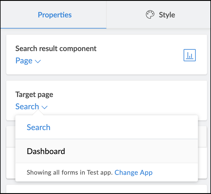 - Click on the Target Page dropdown in the Properties tab on the right and select the page with the embedded report to show the search results. It can either be the same page or a different page in your application: