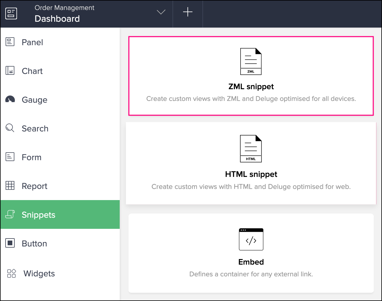 In the page builder, click Snippets on the left, then drag and drop the ZML Snippet on to the required position on your page. The ZML Snippet editor will appear.