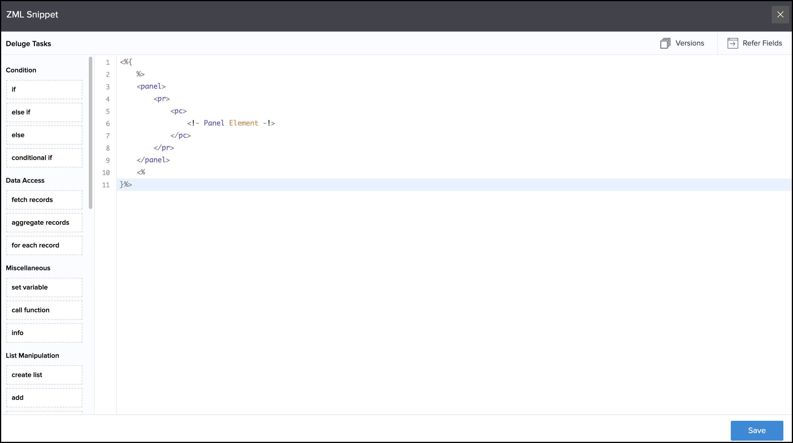 Add the required ZML code. Below image shows a reference code to add a panel in the ZML snippet.
