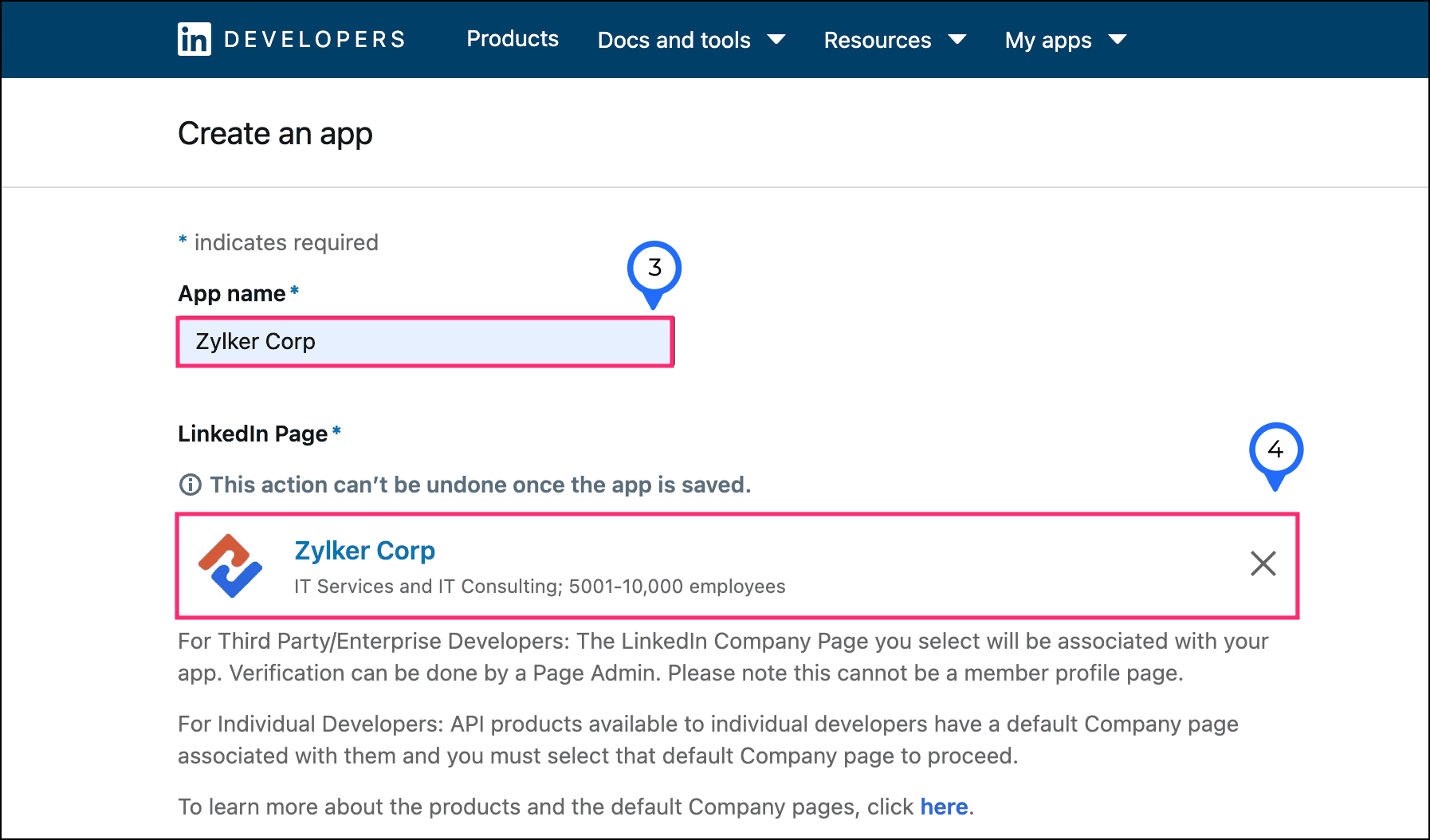 Info: This app name is essentially a label for your application within the LinkedIn's API system. 4. Select either your company name or your company's