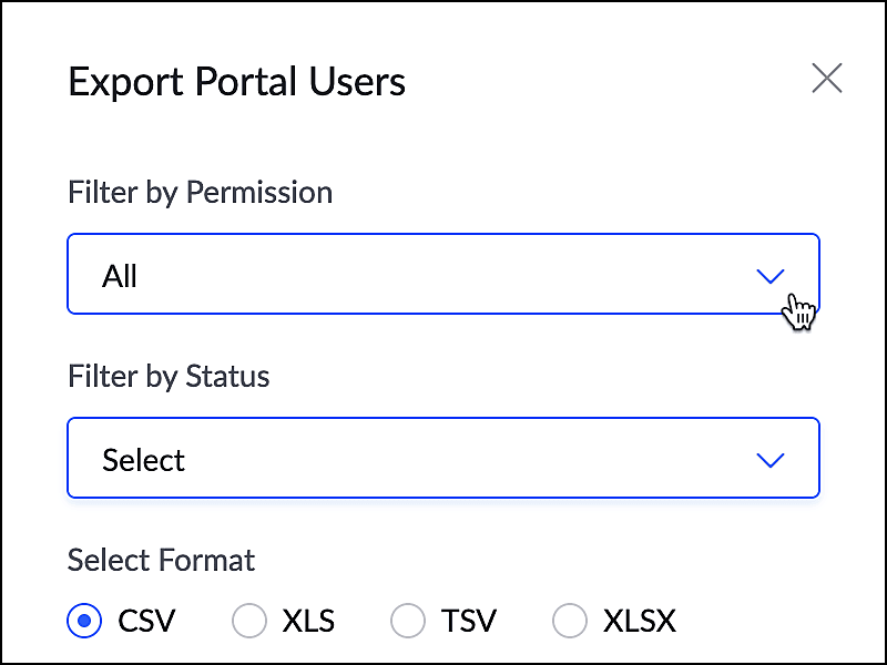 3. Select the permission from the dropdown Filter by permission, based on which the portal users will be exported. By default, portal users will be exported regardless of which permission set they have been assigned to.