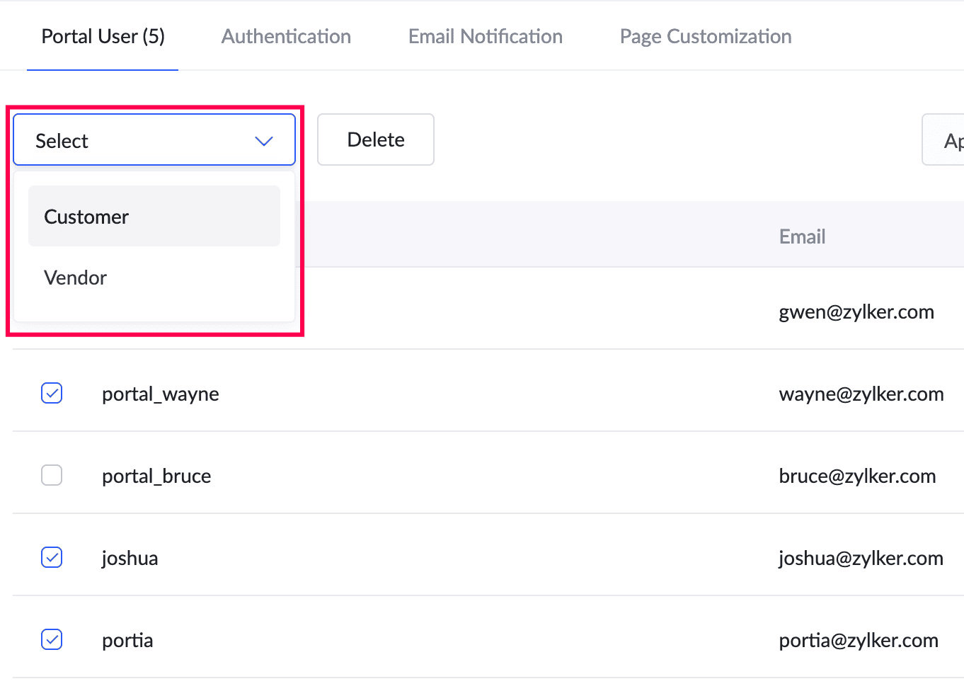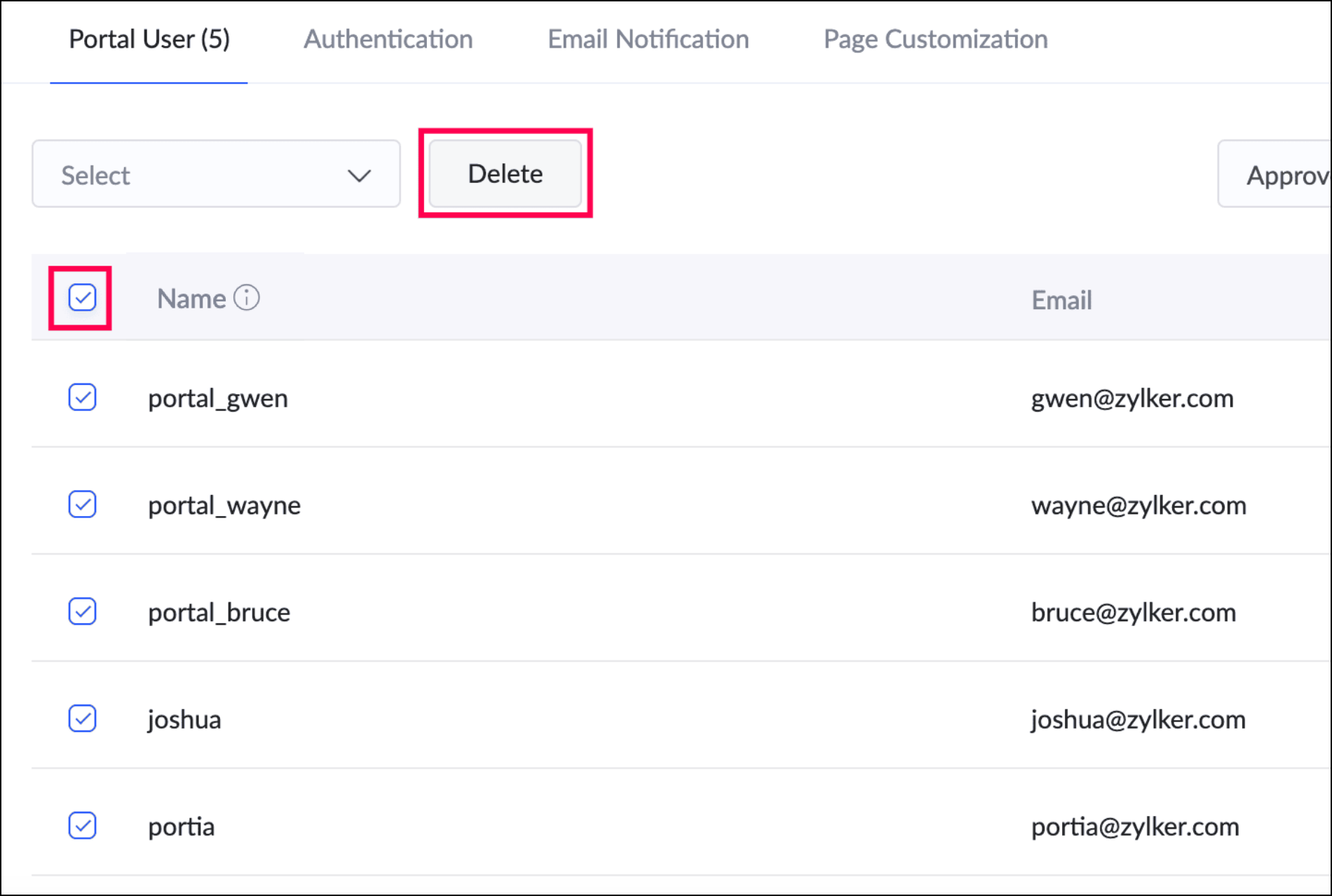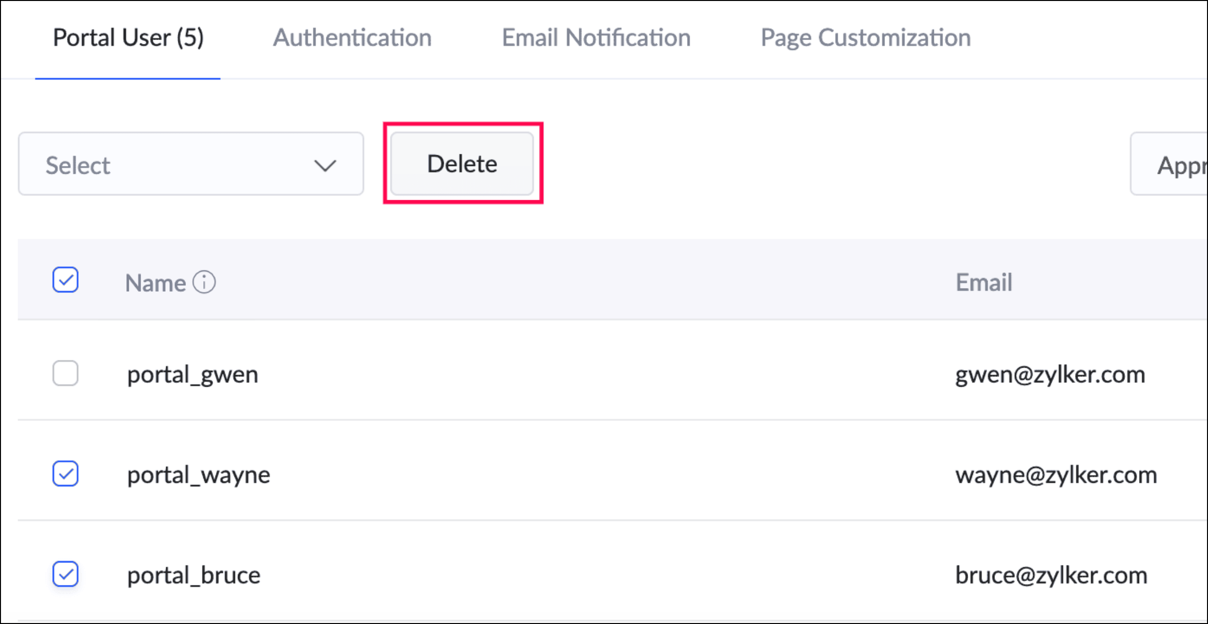 - Group of Portal Users : Tick the checkboxes present on the left side of the portal users. Click Delete above the list of portal users to remove them.