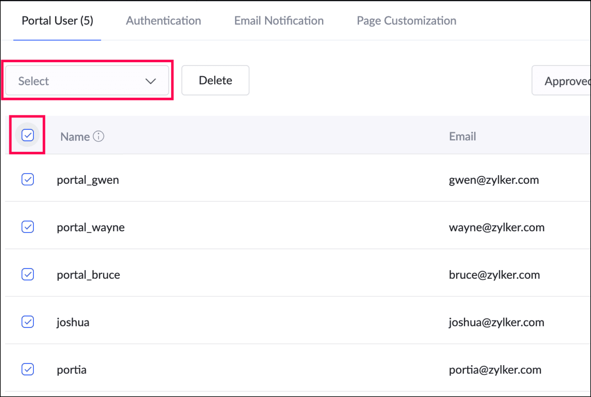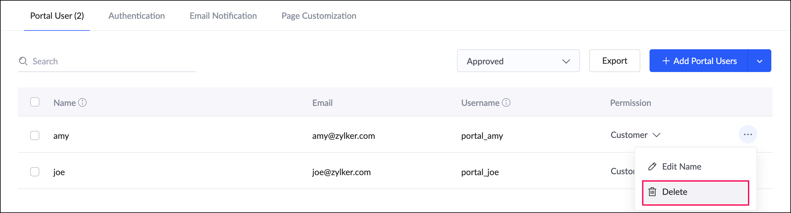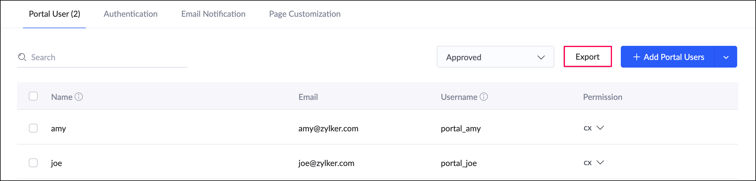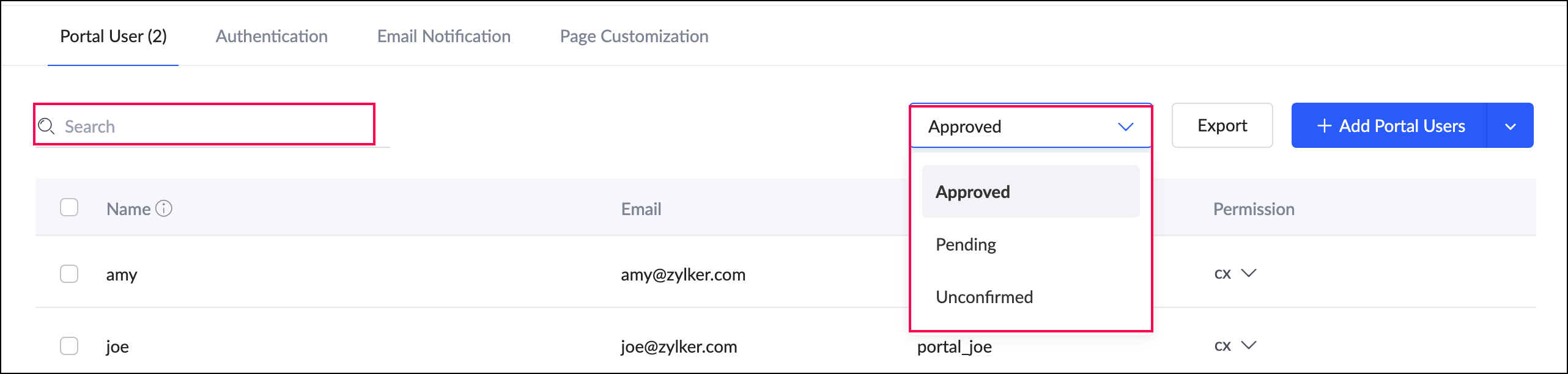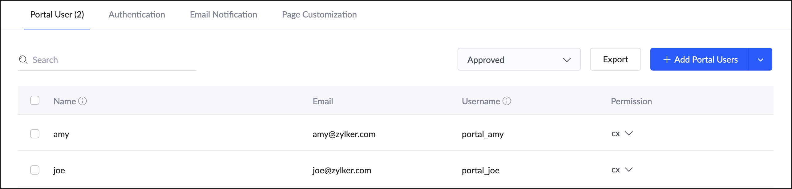 - Approved - This is the list of portal users who have signed up for a portal and have been approved by an admin. It also enlists portal users who have accepted the access invitation sent by the admin.