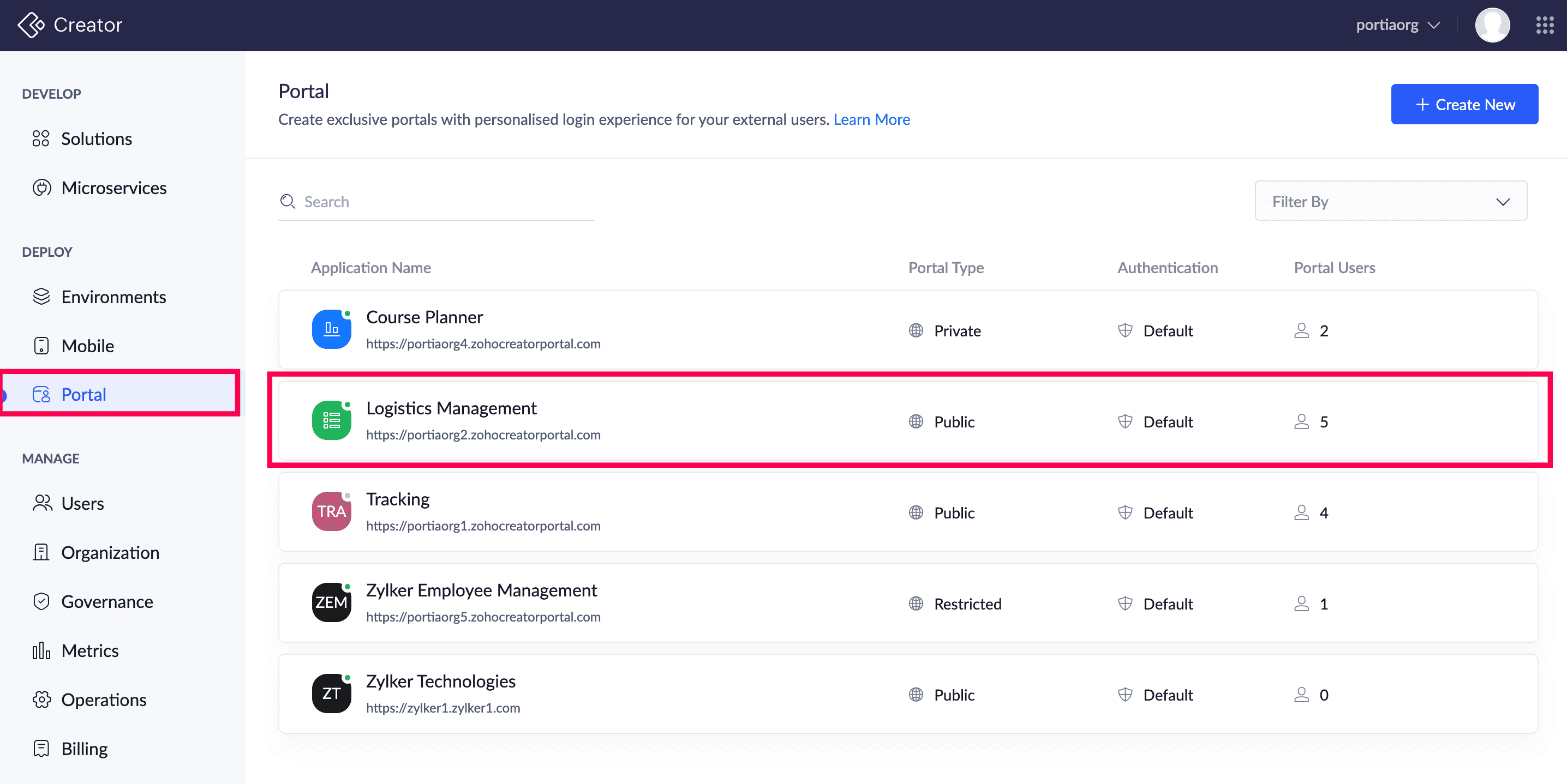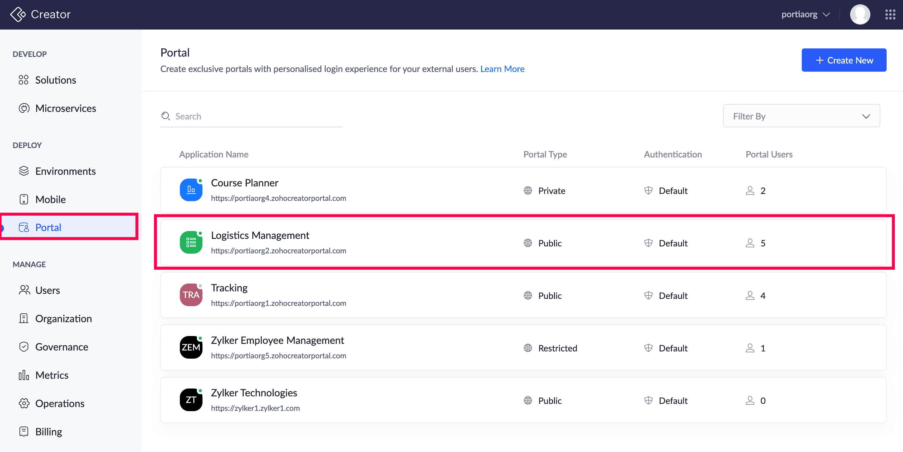 1. Click Portal under DEPLOY in the left pane after you sign in to your Creator account. Click the portal from which you want to export portal users.