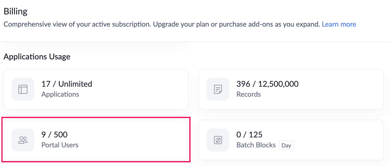 - You can monitor the current and total count of portal users you have purchased in the Billing page.