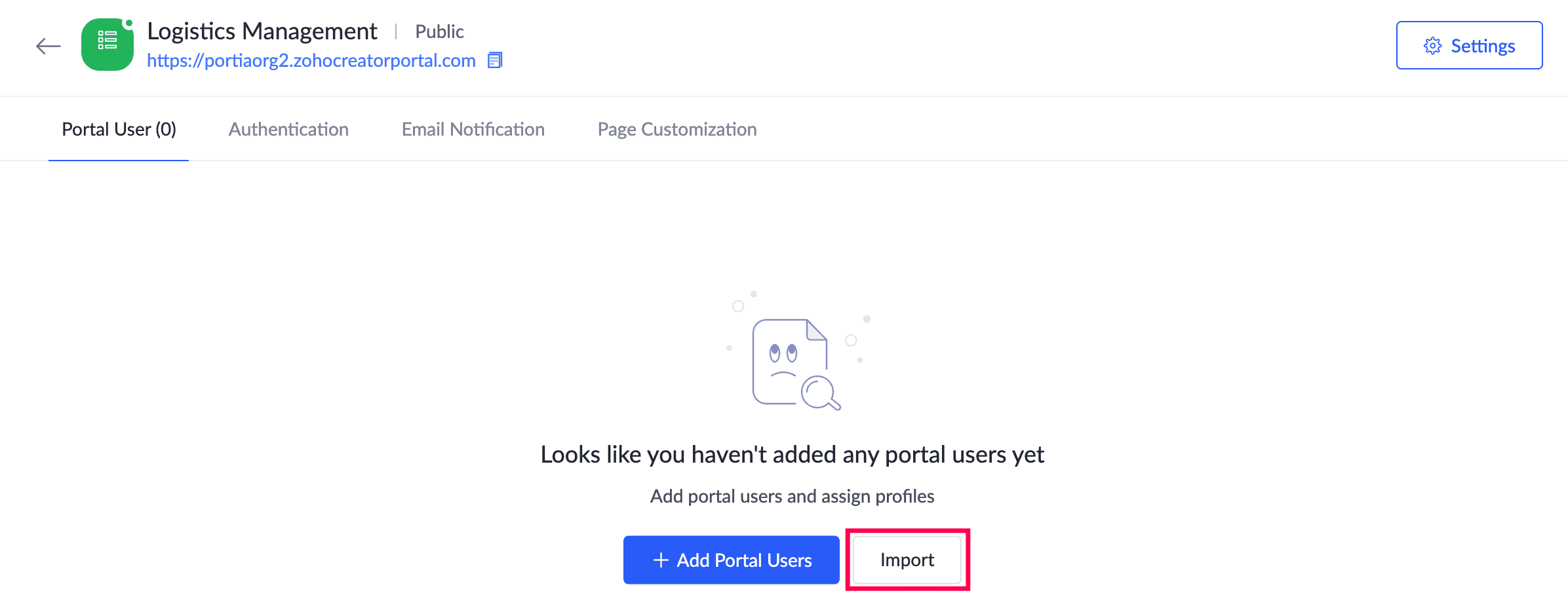 3. Click Import. This will be situated in the center if you are adding portal users for the first time or will be available when you click the dropdown beside +Add Portal Users if you've previously added them.