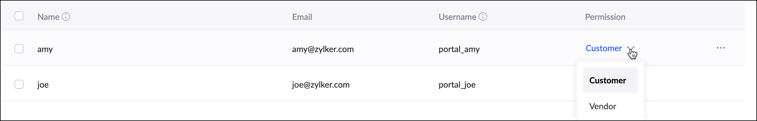 Permission dropdown. The default permission set selected while creating the portal will be assigned here by default, which can be changed according to your preference.