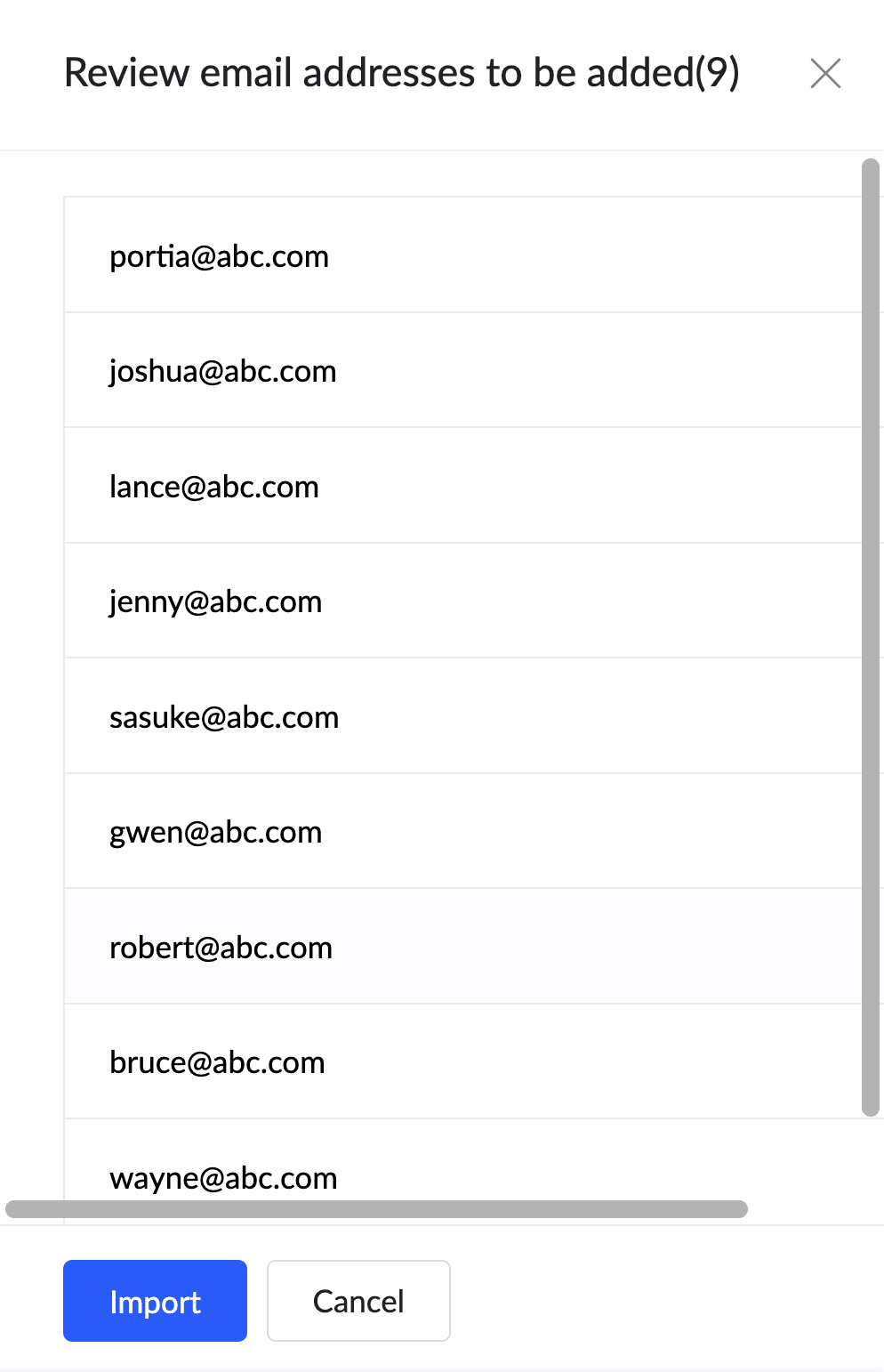 6. Click Import. The valid email addresses will be displayed for in the Review email addresses before addition pane. Click Import again.