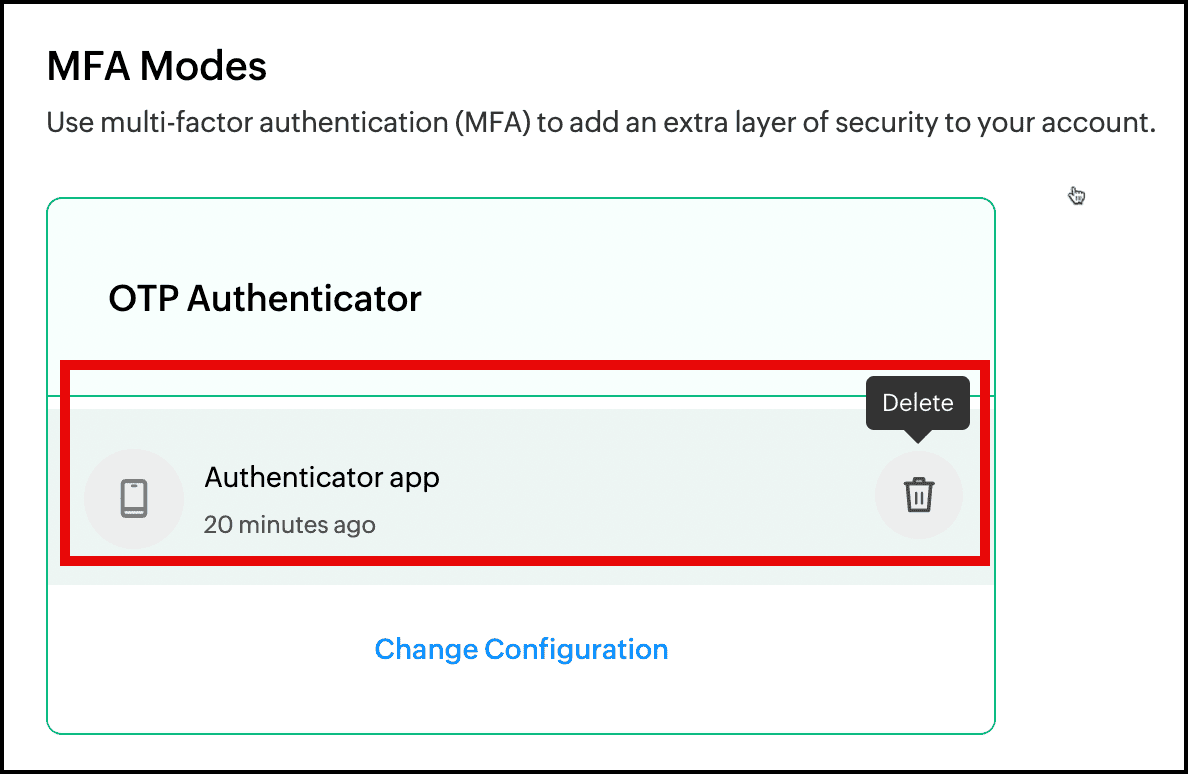 - You can also delete the configured authenticator by clicking the Delete Configuration button. Click Yes, Delete in the popup that appears, and you'll be taken to step 4 of this section to configure a new authenticator.