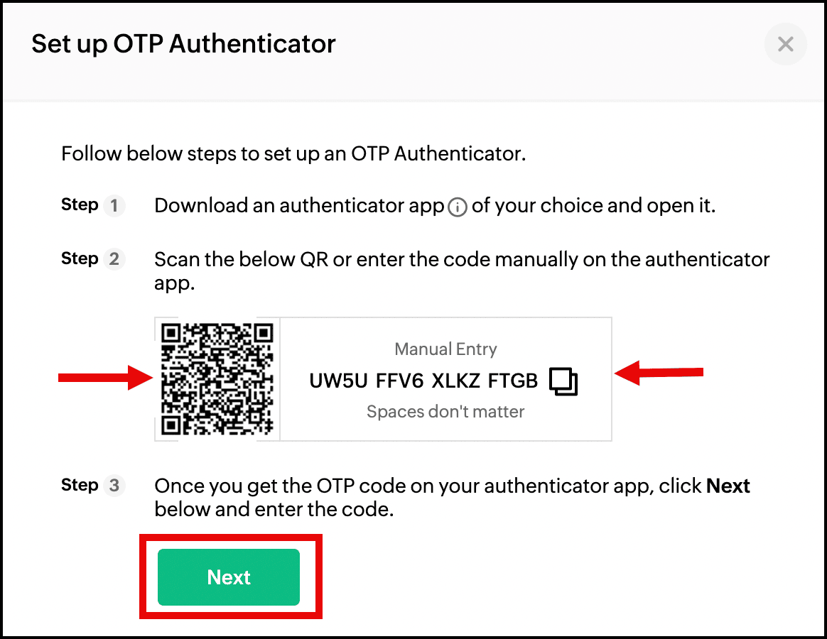 4. The Set up OTP Authenticator pop up will appear, in which a QR code and an alphanumeric code will be shown. Click Next after performing either of the following.