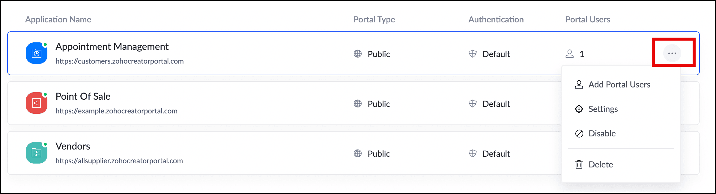 2. Click the ellipsis icon (...) at the end of the required portal for which you want to enable MFA, and then select Settings.