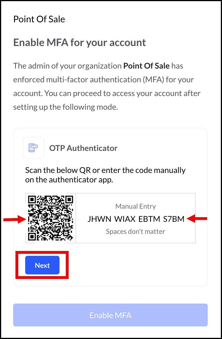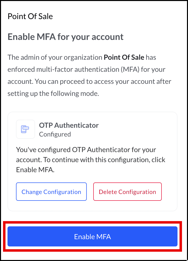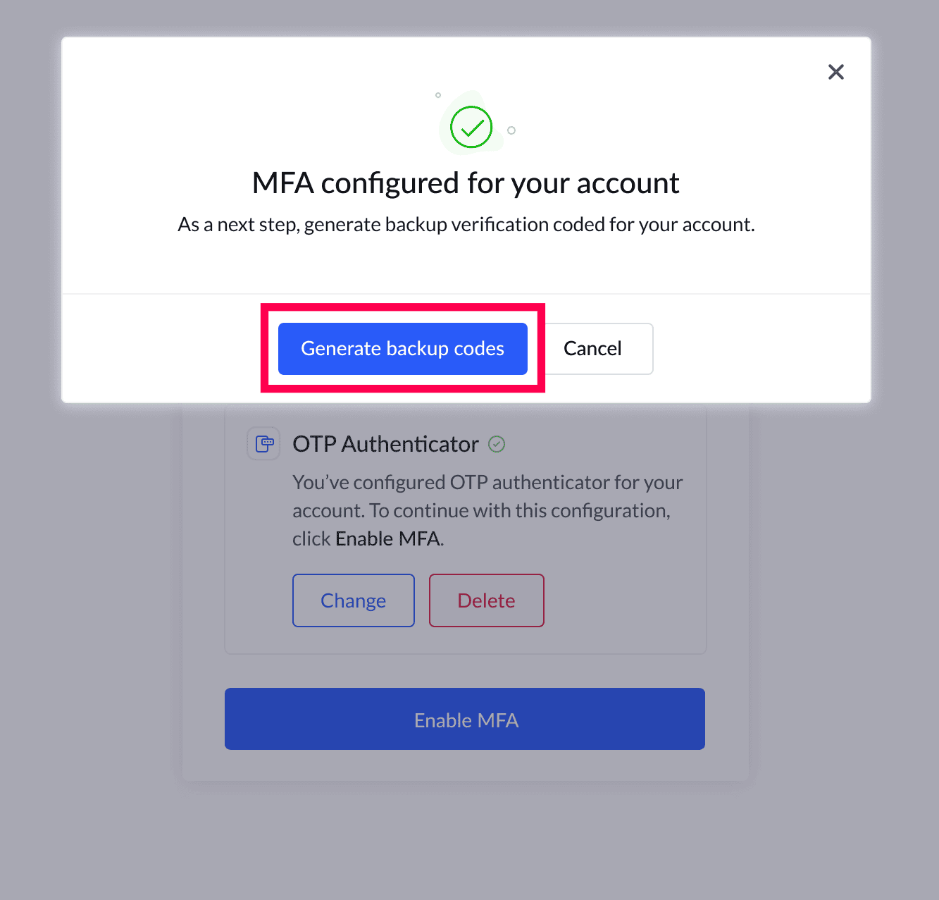 6. Click Enable MFA, once you've verified the code and configured the OTP authenticator.