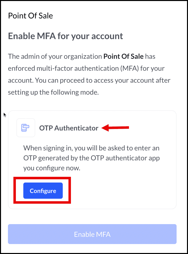 3. A screen prompt to configure OTP Authenticator MFA will appear. Click Configure beneath the OTP Authenticator card.