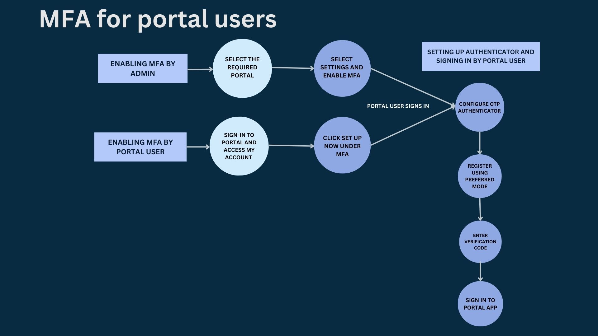 - Admin-enforced: If you are a super admin/admin, you can enable MFA for portal users in your respective portals.