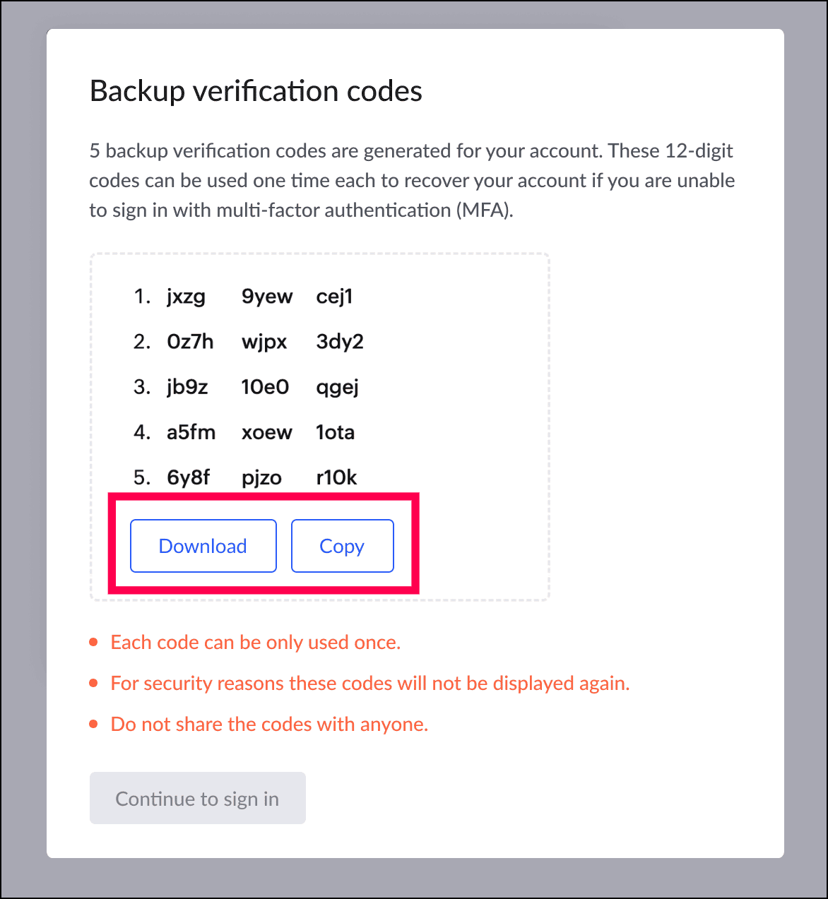 Info: It is recommended to generate backup verification codes. These codes will help you recover your account if you lose access to your mobile number and can't sign in.