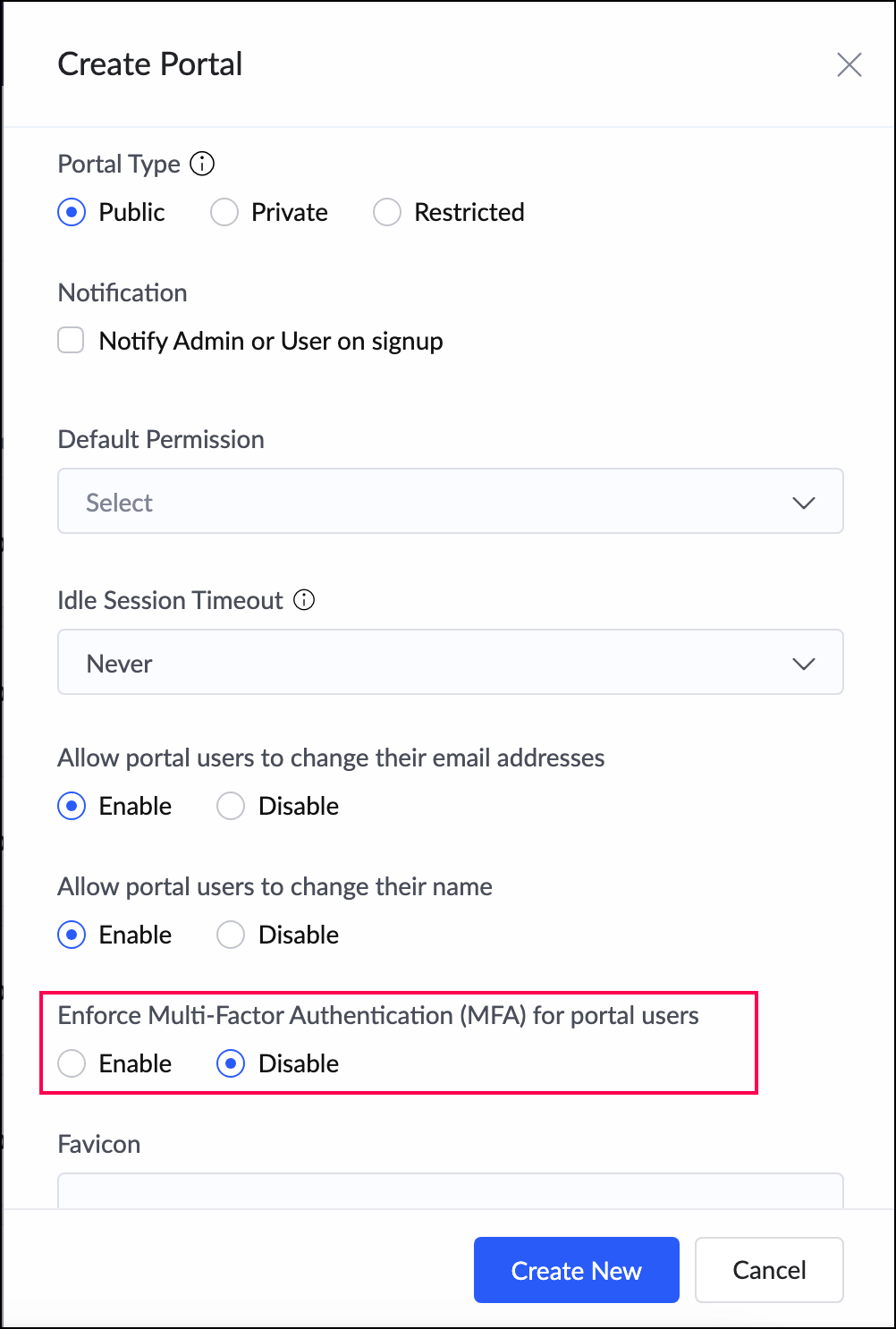 - If you're setting up a portal for the first time, you can enable MFA in the Create Portal slider and click Create New to finish creating your portal.