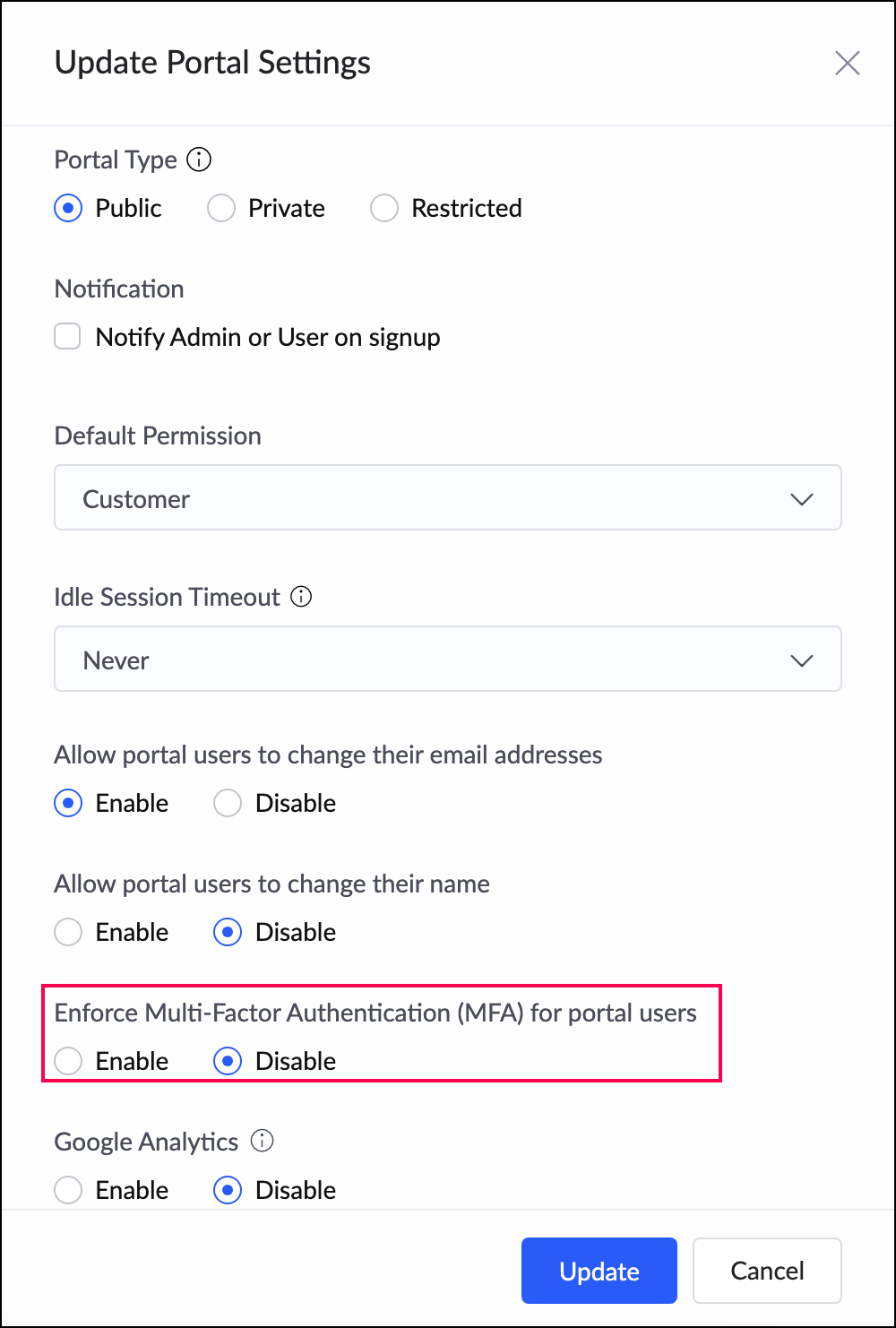 3. The Update Portal Settings slider will appear. Click Enable under Enforce Multi-Factor Authentication (MFA) for portal users in this slider.