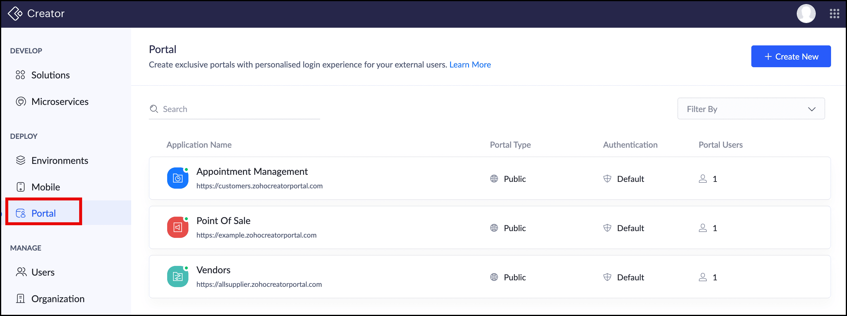 1. Click Portal under the Deploy section in the left pane. A list of already configured portals will be displayed