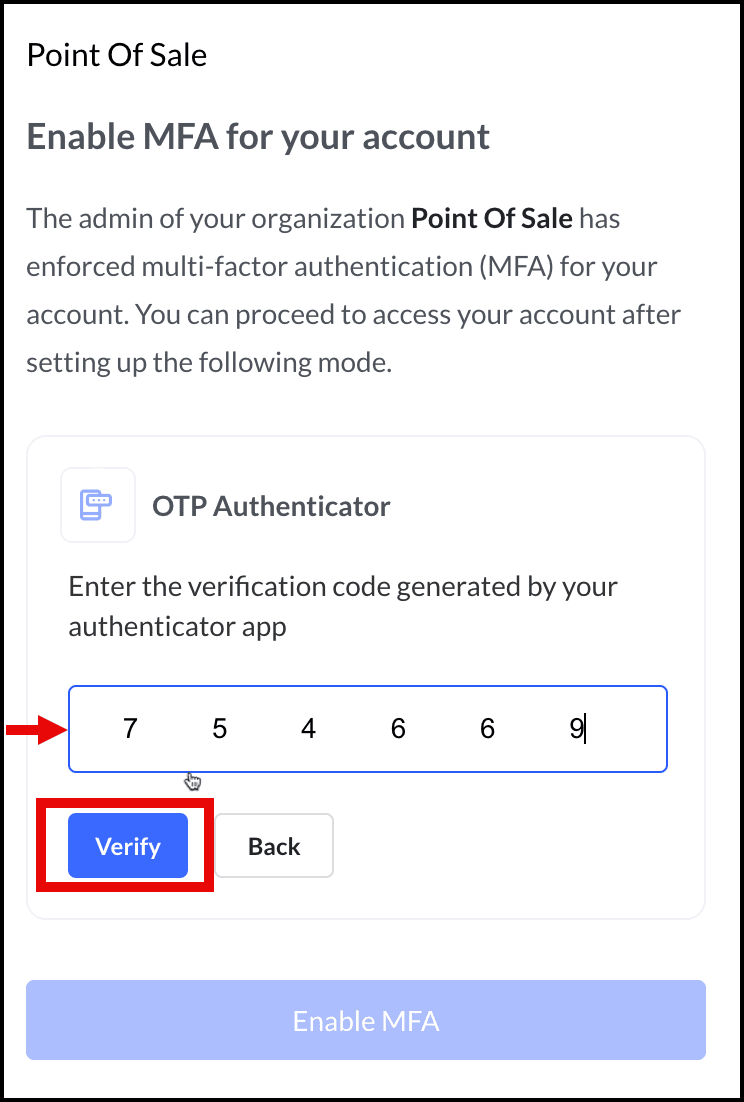5. An OTP will be generated on your app. Click Verify after entering this OTP beneath the Enter OTP input box to complete the MFA configuration.