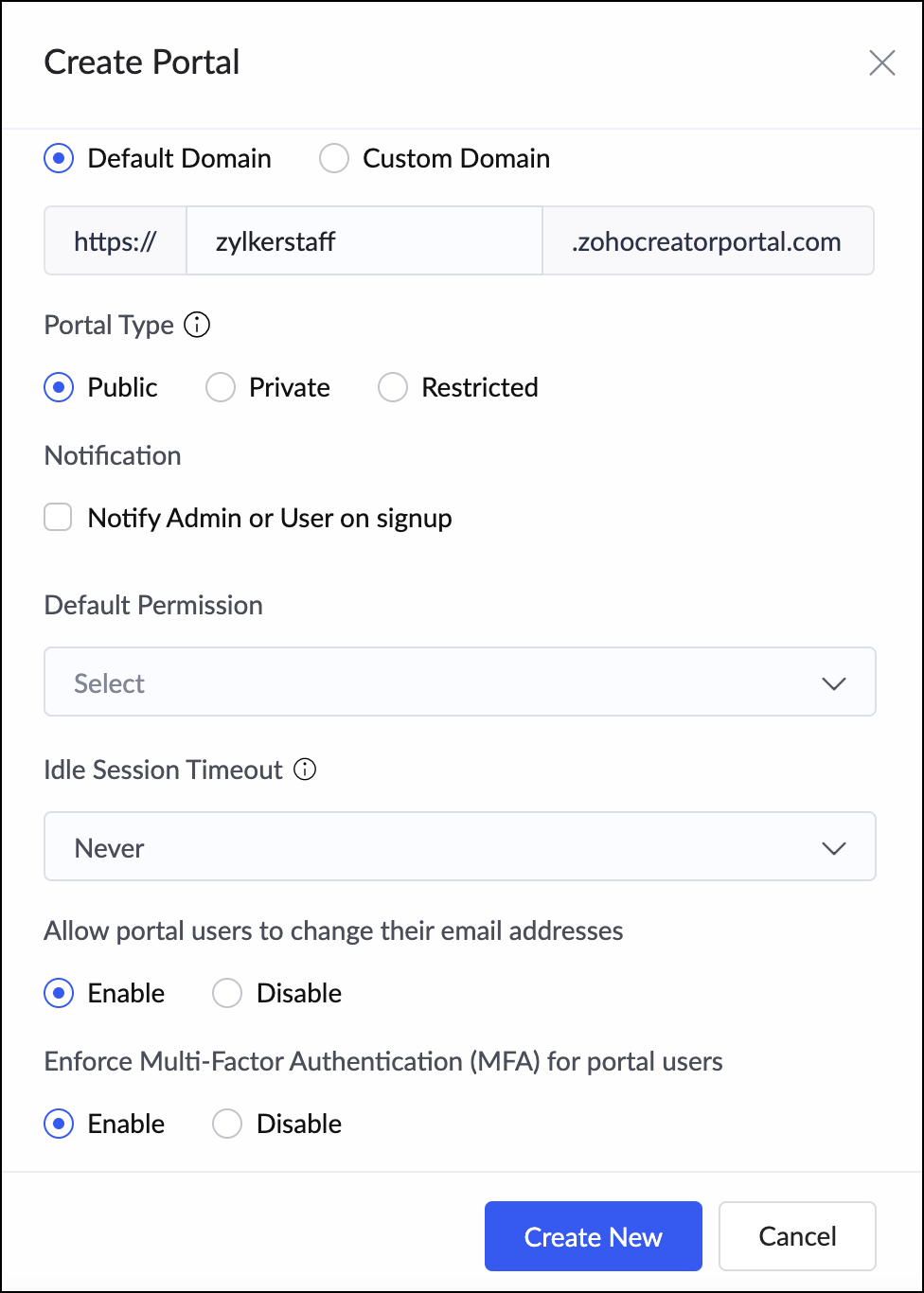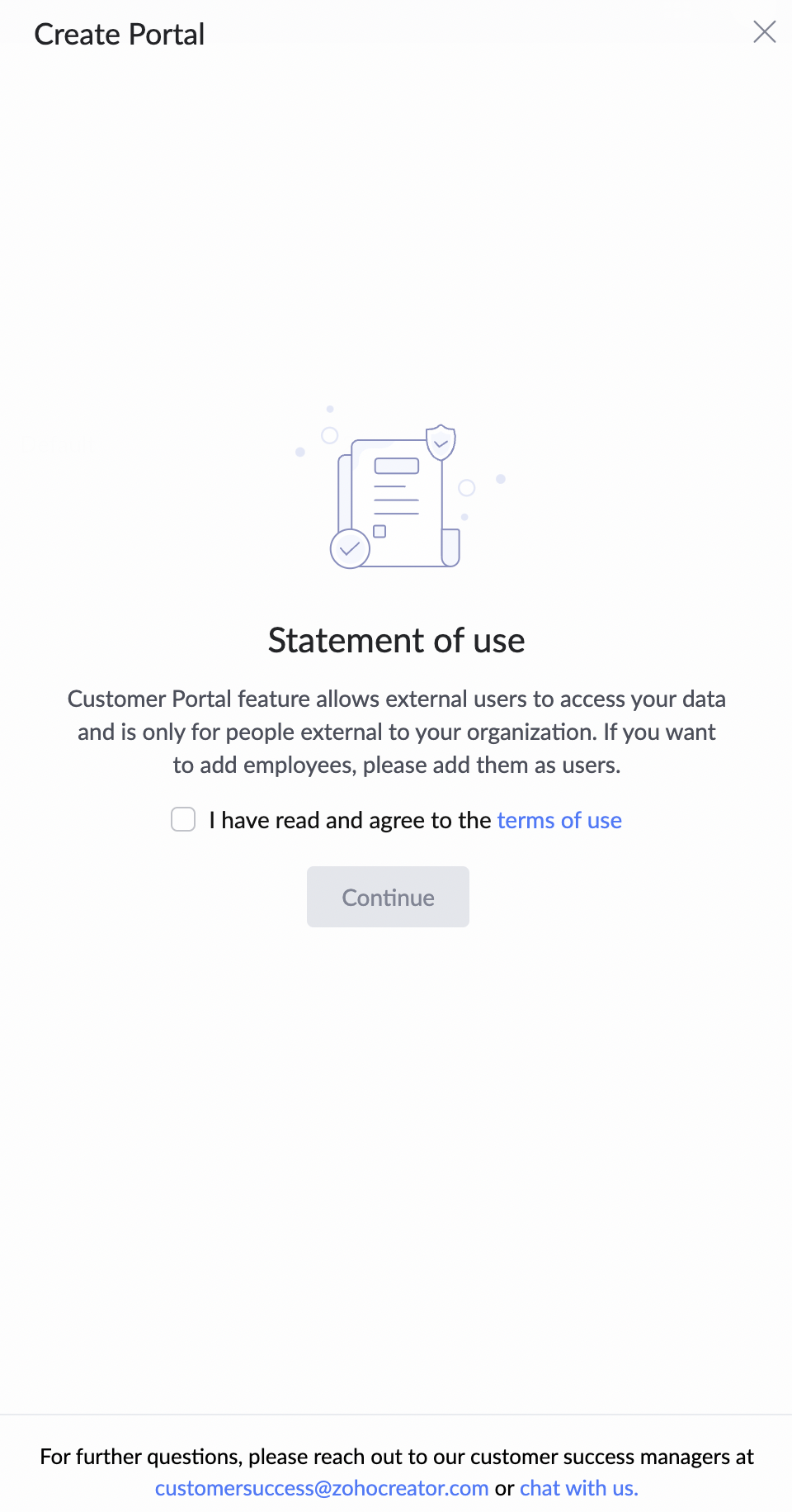 The Create portal page slides in from the right which contains the Statement of use. According to the terms of use, only external users like vendors etc., can be added as a portal user. Click Continue after agreeing.