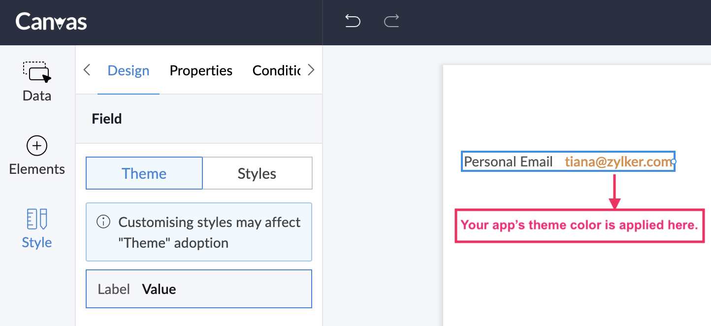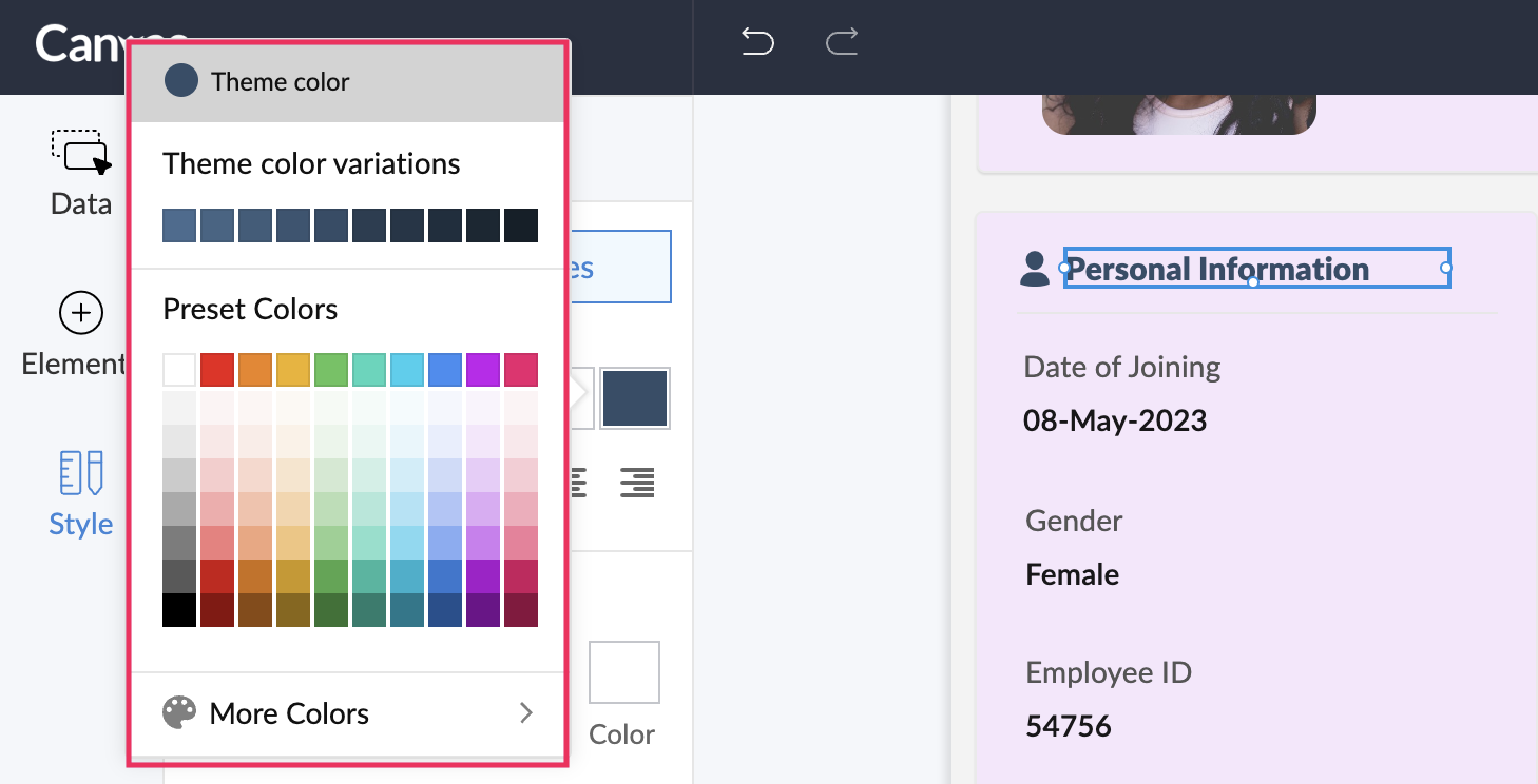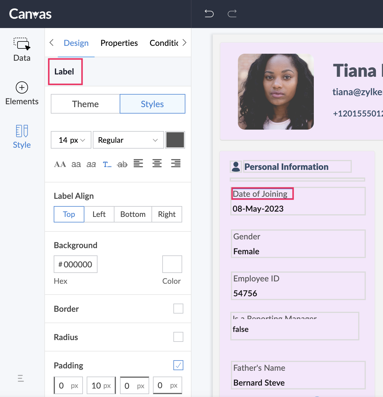You can customize both the field's label and value using the style options, as well as by choosing options from within the tab. The below image shows the style options for the "Date of joining" field. You can customize the style for the "08-May-2023" value as well.