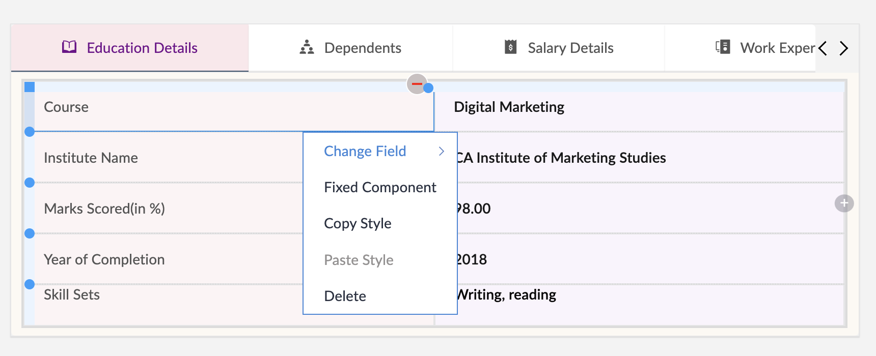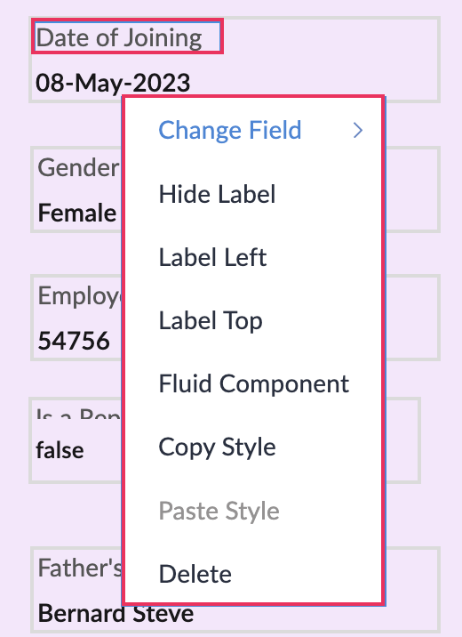 - Right-click on the label/value to change the field, hide the label, move the label to the left or top, make the component fixed or fluid, copy the style or paste from another style, and delete the field.