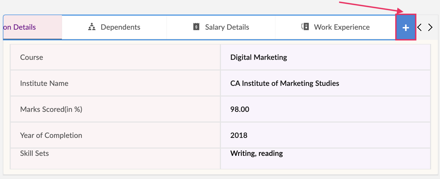 Employee Details module which has three tabs: Dependants, Salary Details, and Work Experience all within a