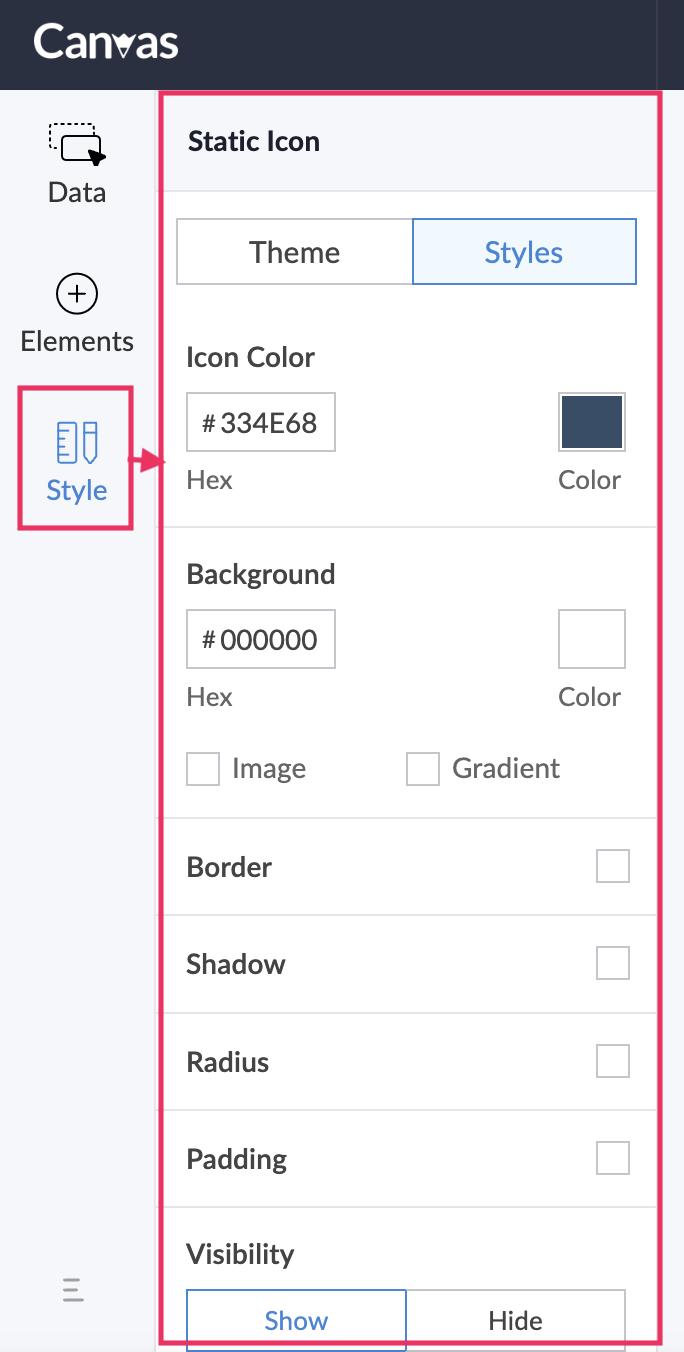- Icon: The icon color, background color, background image, border, shadow, and visibility can be customized.